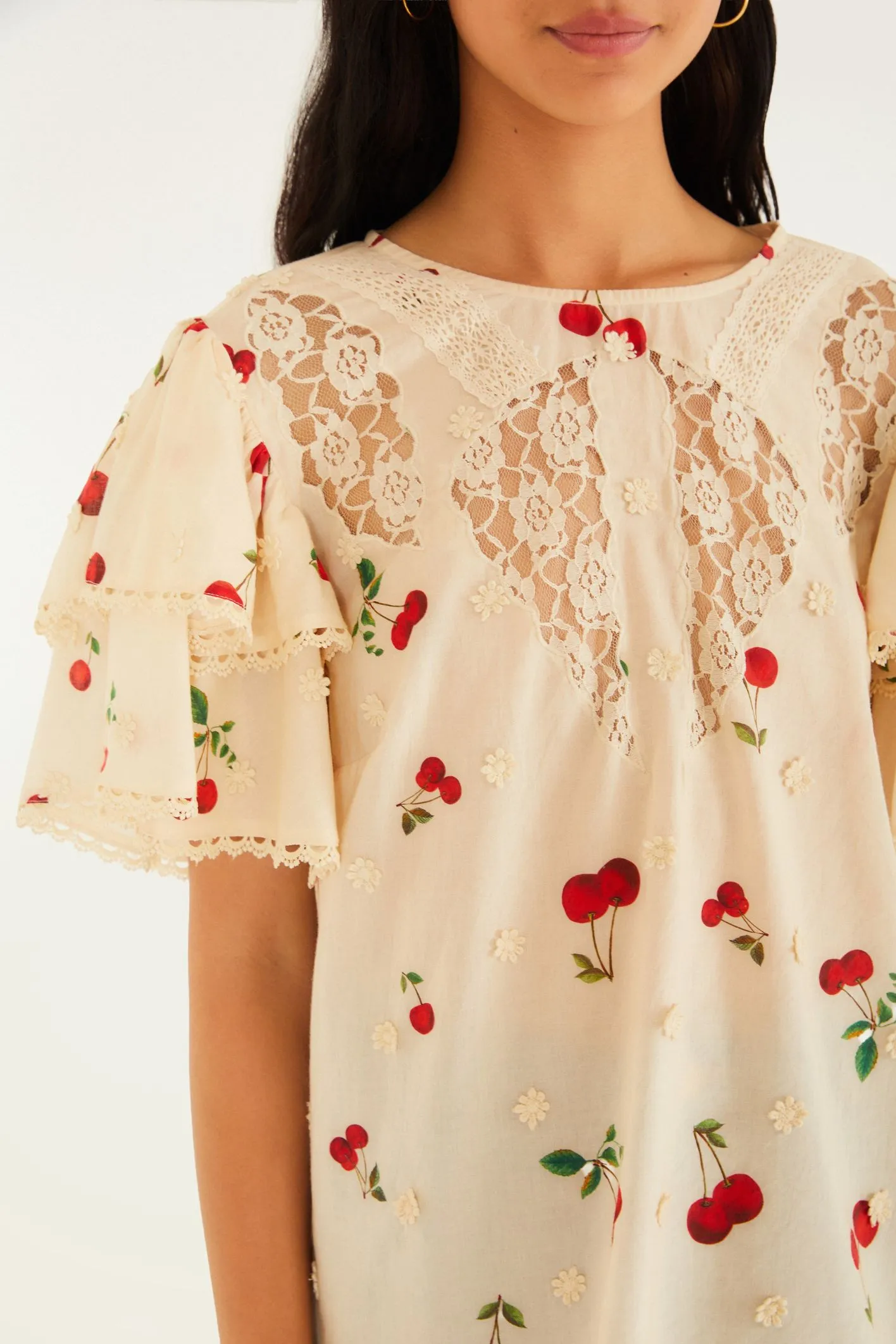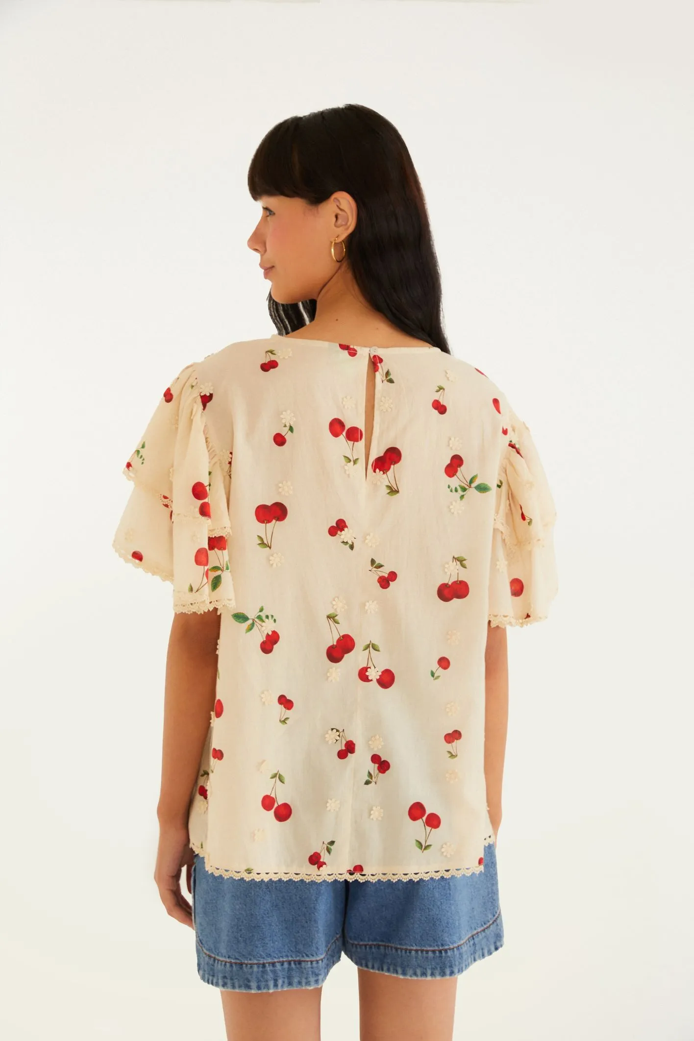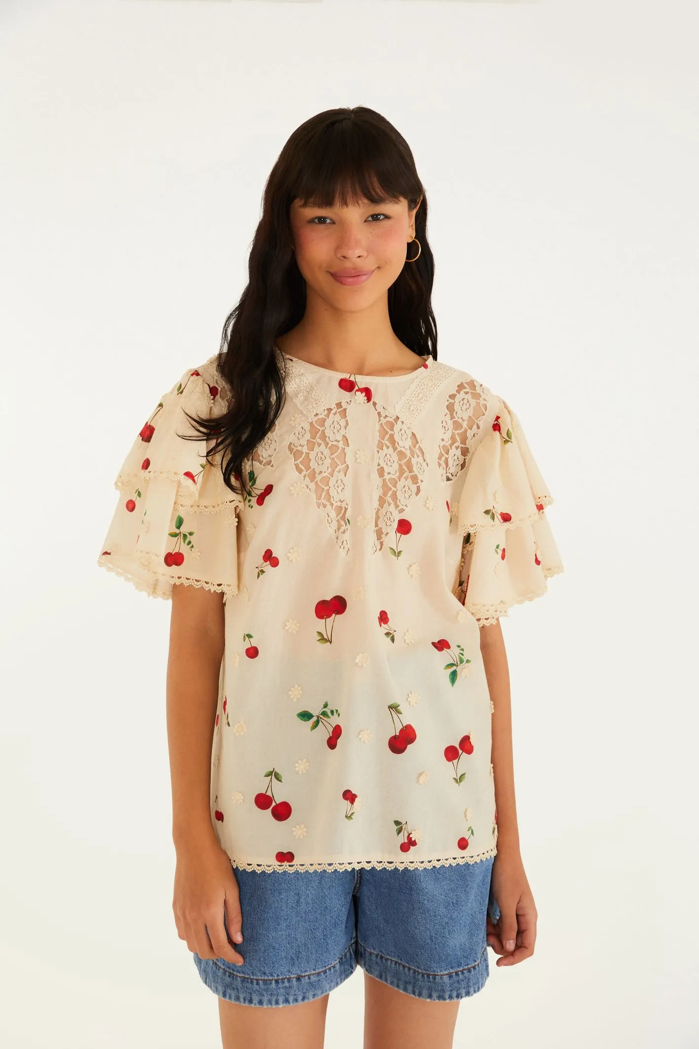 bata artesanal estampa cereja. com decote redondo clássico e mangas amplas, revela um toque delicado através dos acabamentos em renda composta de fios acetinados. perfeita para dias casuais e ocasiões especiais, valoriza a produção com um toque único. FARM RIO original – verão 26.