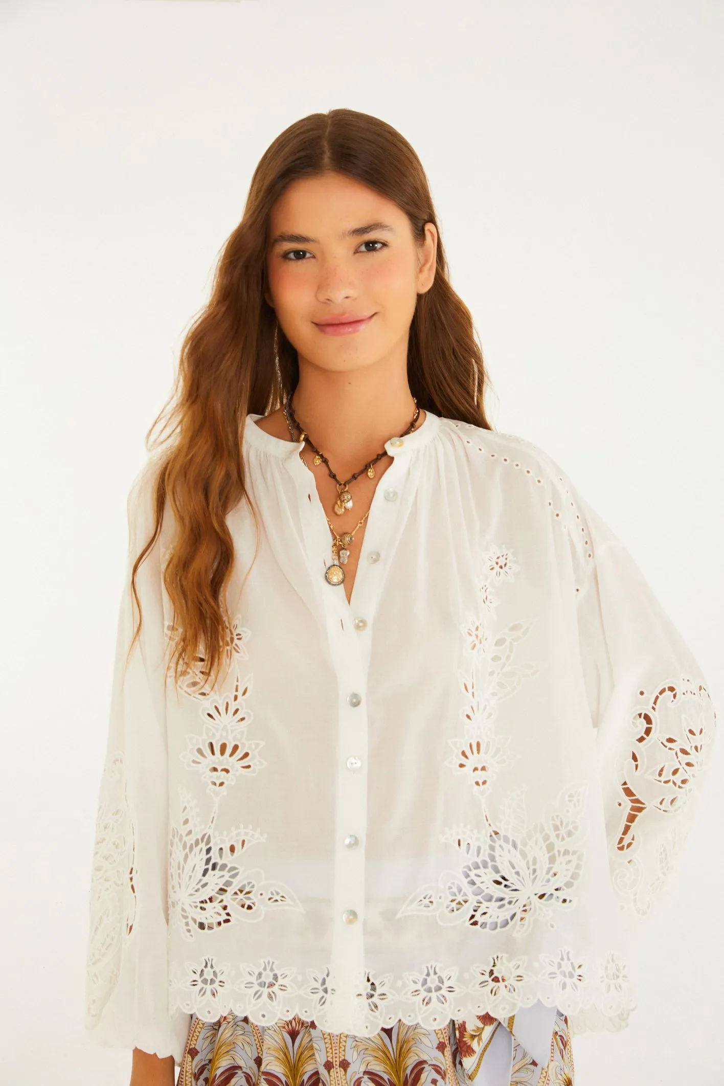 bata bordada richelieu. apresenta um decote redondo com botões, trazendo um toque de leveza e originalidade. as mangas são amplas, com delicados bordados que enaltecem a peça. a modelagem é solta, ideal para um passeio casual ou momentos especiais. um clássico que complementa diferentes visuais. FARM Rio, coleção Carioca – inverno 26.