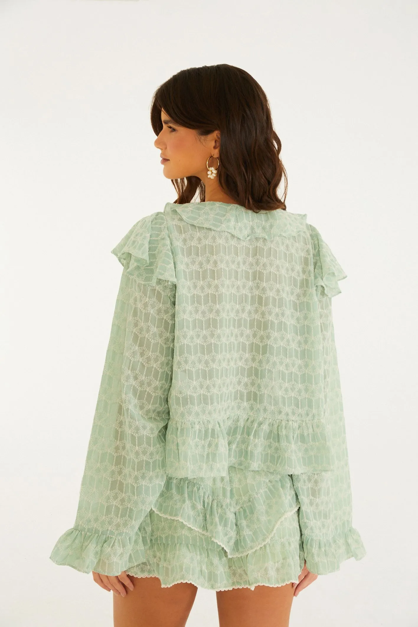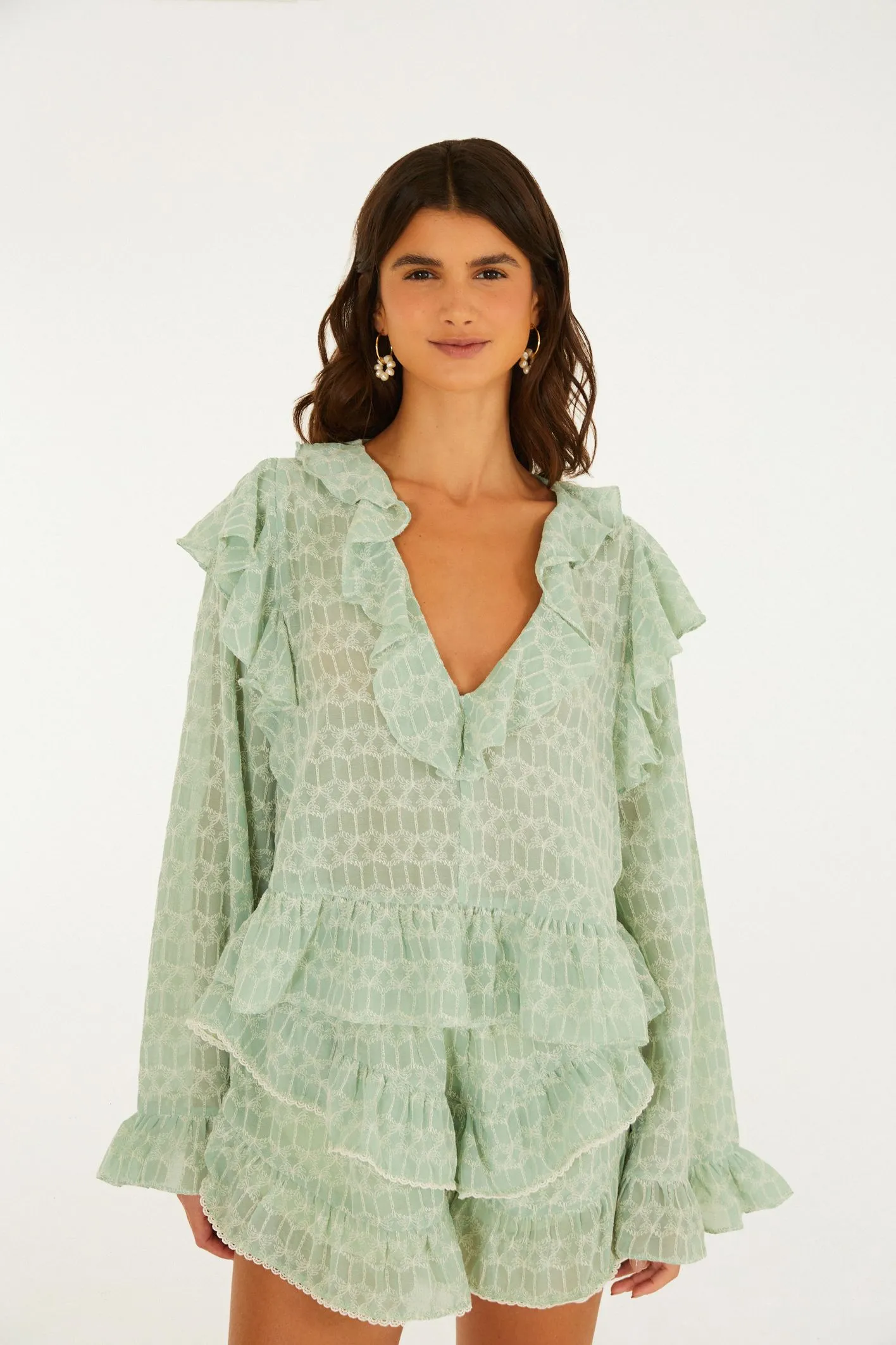 bata fluida babados coqueirinho. com decote em v e babados que trazem movimento, essa peça de mangas longas é perfeita para ocasiões casuais ou momentos especiais. o corte solto oferece conforto e originalidade, ideal para compor looks descomplicados. deixe-se envolver por esta criação única. FARM Rio, coleção Carioca – inverno 26.