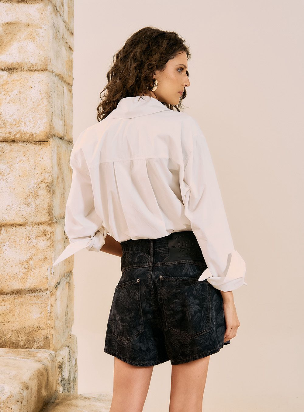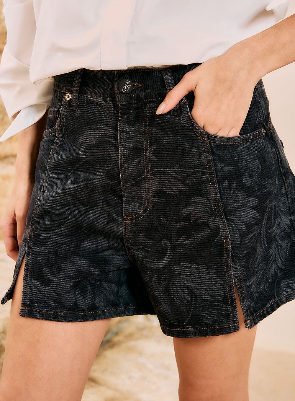 Peça: Bermuda jeans com estampa exclusiva e fenda frontal, trazendo um toque moderno e cheio de personalidade.