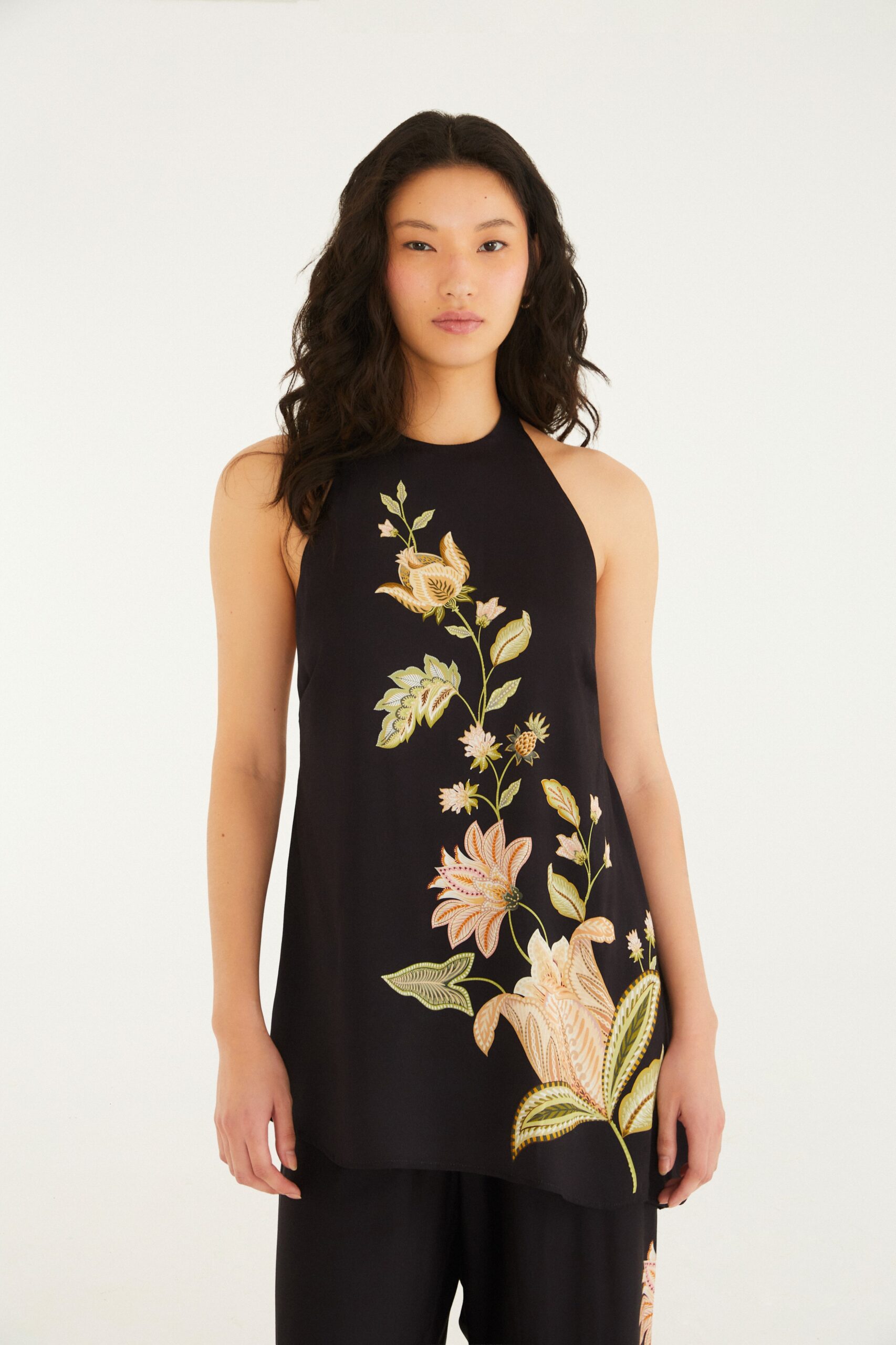 blusa jamile. apresenta modelagem reta com alças finas e ombros à mostra, proporcionando um visual casual e sofisticado. o charme fica por conta do elegante detalhe nas costas abertas, ideal para ocasiões especiais ou um dia descontraído. tecido leve e confortável para um toque de frescor. FARM Rio, coleção Carioca – inverno 26.