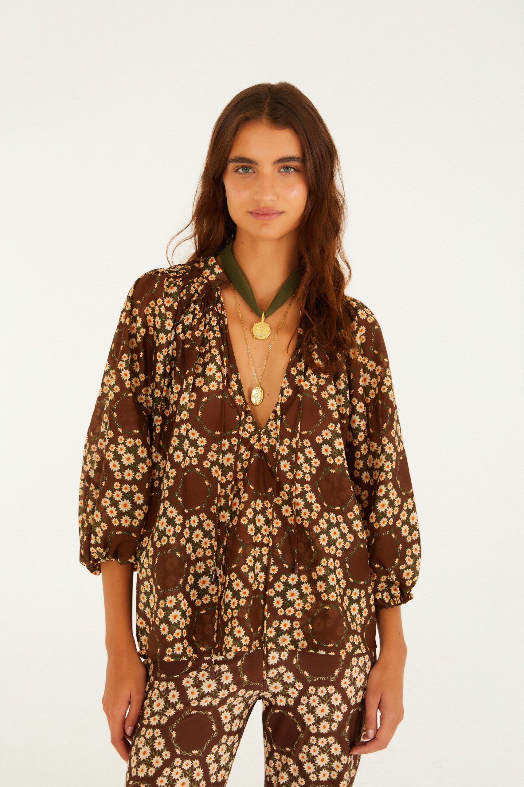 Mangas 3/4 Bufantes: As mangas são volumosas e finalizadas com elástico nos punhos, criando um leve efeito bufante que adiciona um toque romântico ao visual.