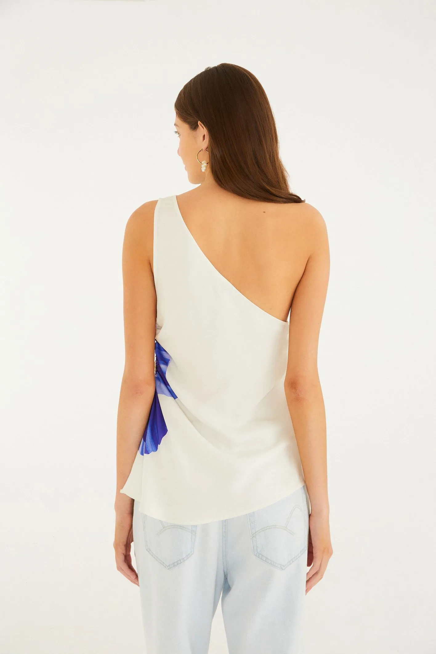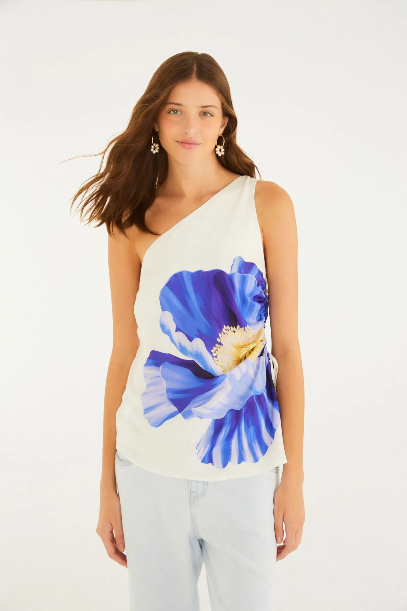 blusa ombro só lola. traz um design casual com seu corte assimétrico e ombro à mostra, exalando originalidade. a peça é adornada por franzidos com cordinha na lateral, permitindo ajuste personalizado. perfeita para um passeio leve ou um encontro descontraído. FARM Rio, coleção Carioca – inverno 26.