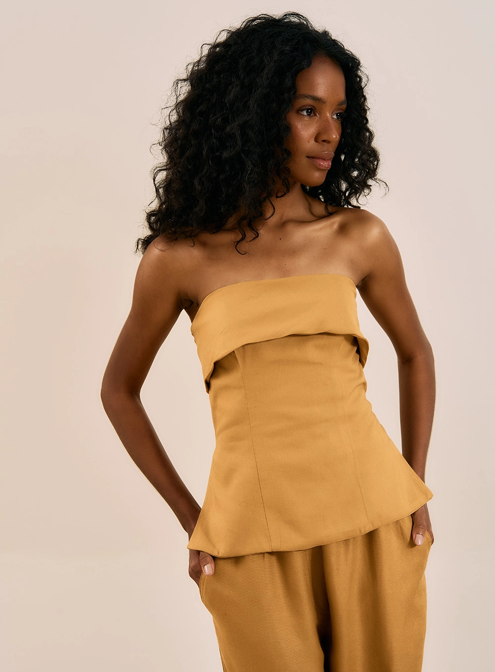 Design: Modelagem tomara que caia com detalhe de dobra superior e barra evasê estilo peplum