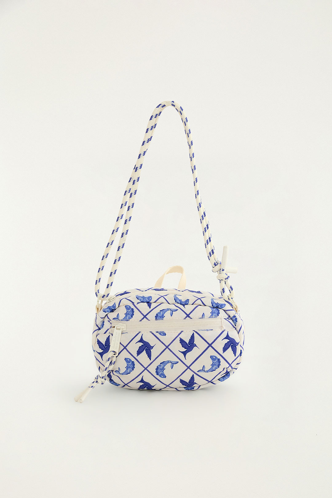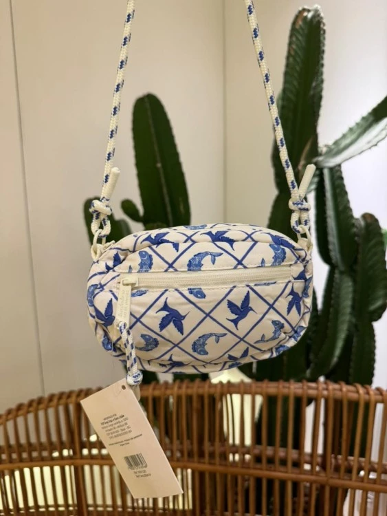 – O design da bolsa apresenta um padrão azulejado azul, com linhas diagonais que formam um efeito de rede, adornado com pequenos detalhes florais ou geométricos azuis.