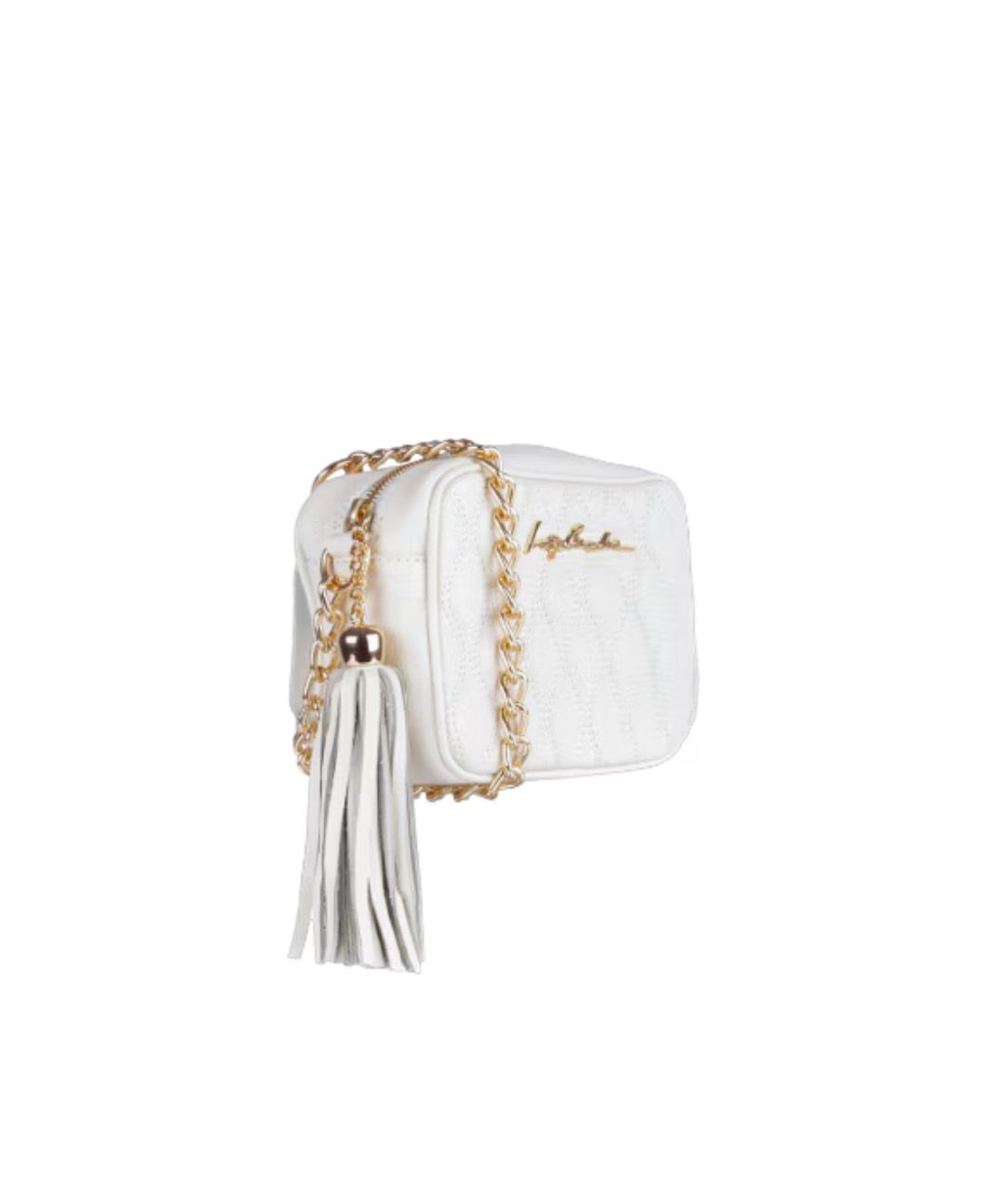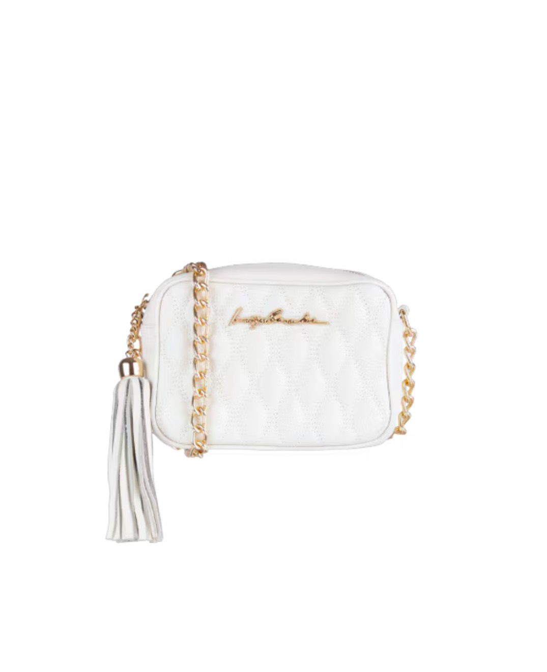 A bolsa off white é produzida em couro. A peça possui tamanho médio, formato retangular, compartimento interno, tag da marca metalizada aplicada na parte frontal, alça longa, acabamento pespontado e fechamento superior por zíper com pingente em franjas.