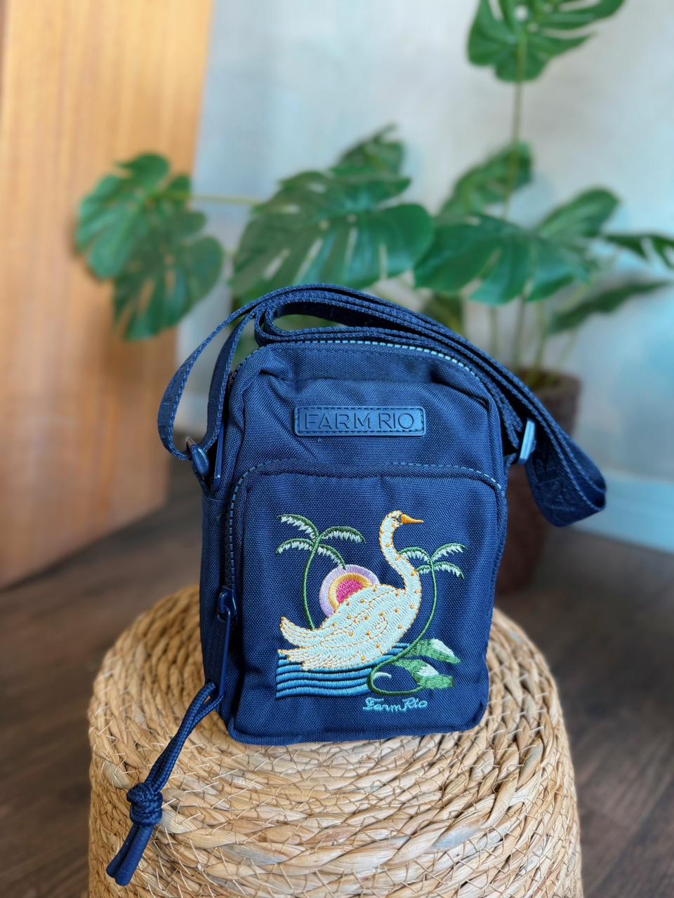 A bolsa da linha Farm Cisne Tropical é uma pequena bolsa transversal (crossbody) de cor azul-marinho (navy). Ela possui:
