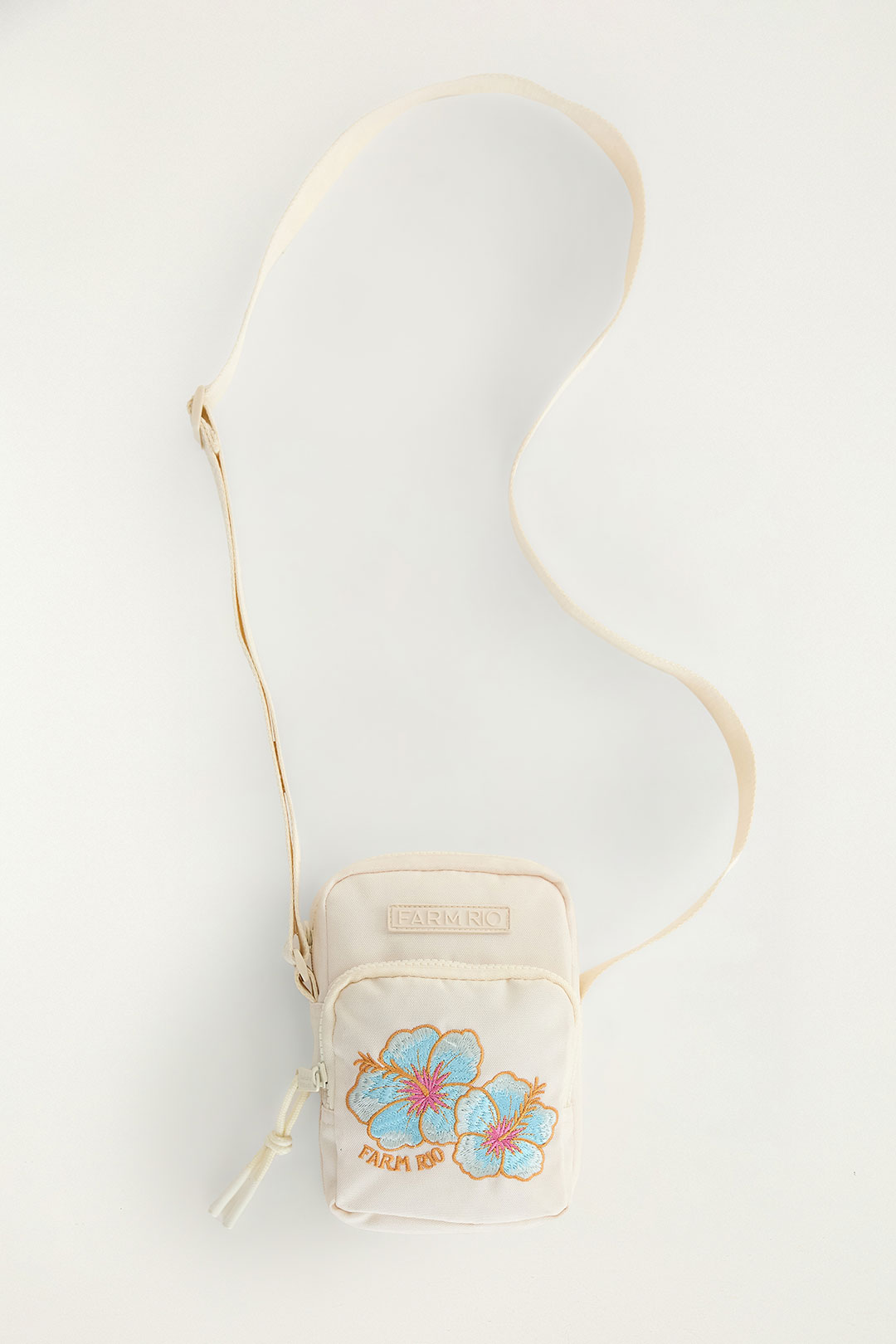 A bolsa da gema hibisco é uma bolsa bordada off-white com um design floral delicado, apresentando uma flor de hibisco azul e rosa no centro. O estilo parece ser inspirado na marca Farm, com um acabamento elegante e minimalista.