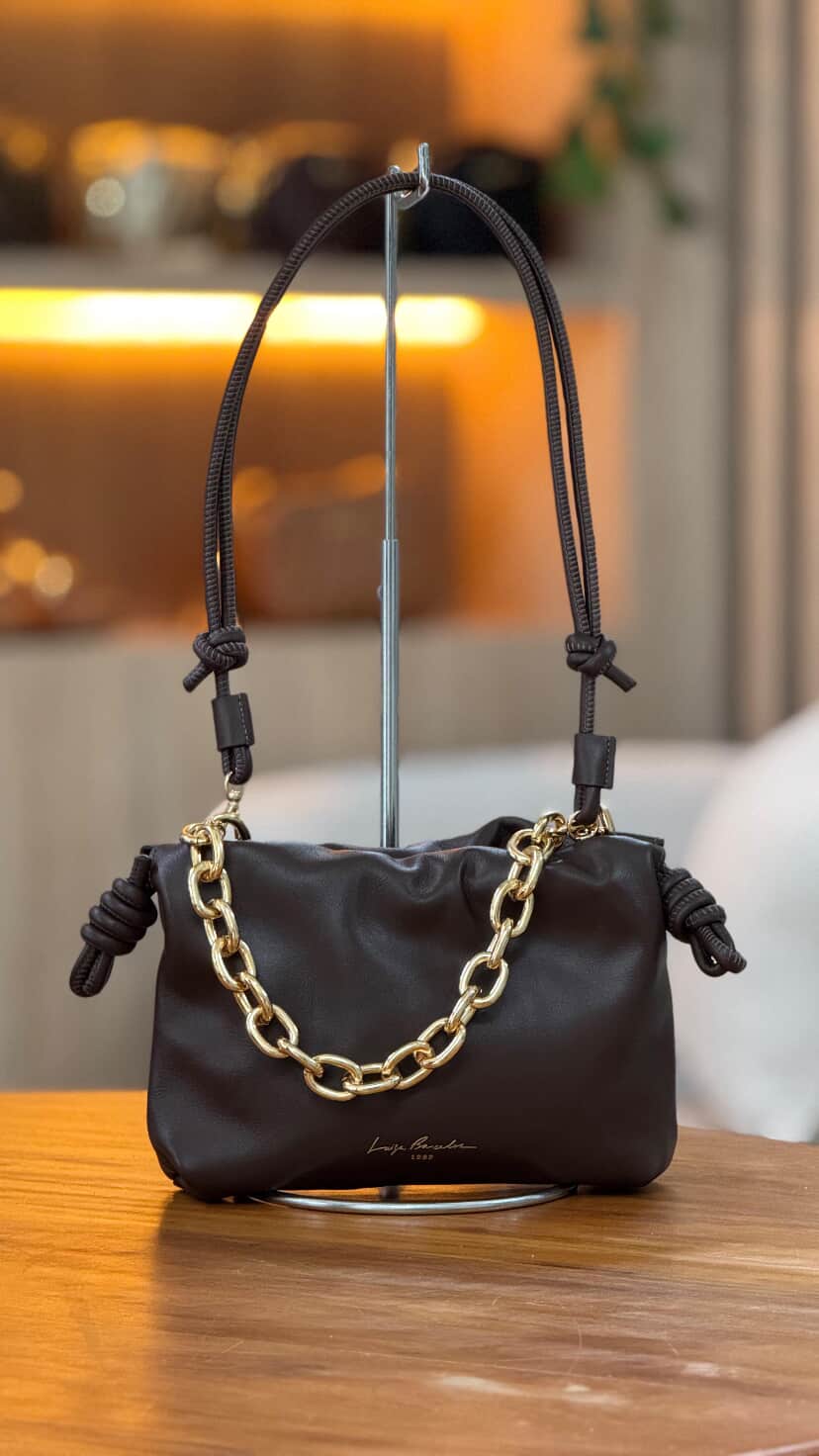 Absolutamente statement, essa bolsa combina o charme do couro café macio com o impacto visual das correntes douradas, trazendo um toque de sofisticação com atitude. Seu fechamento é ajustado o que permite que ela fique mais ou menos slouch e que seu tamanho pequeno também se adapte a necessidade. A alça em rolotê longa adiciona um elemento inesperado ao design, equilibrando modernidade e ampliando as ocasiões de uso como bolsa de mão ou crossbody