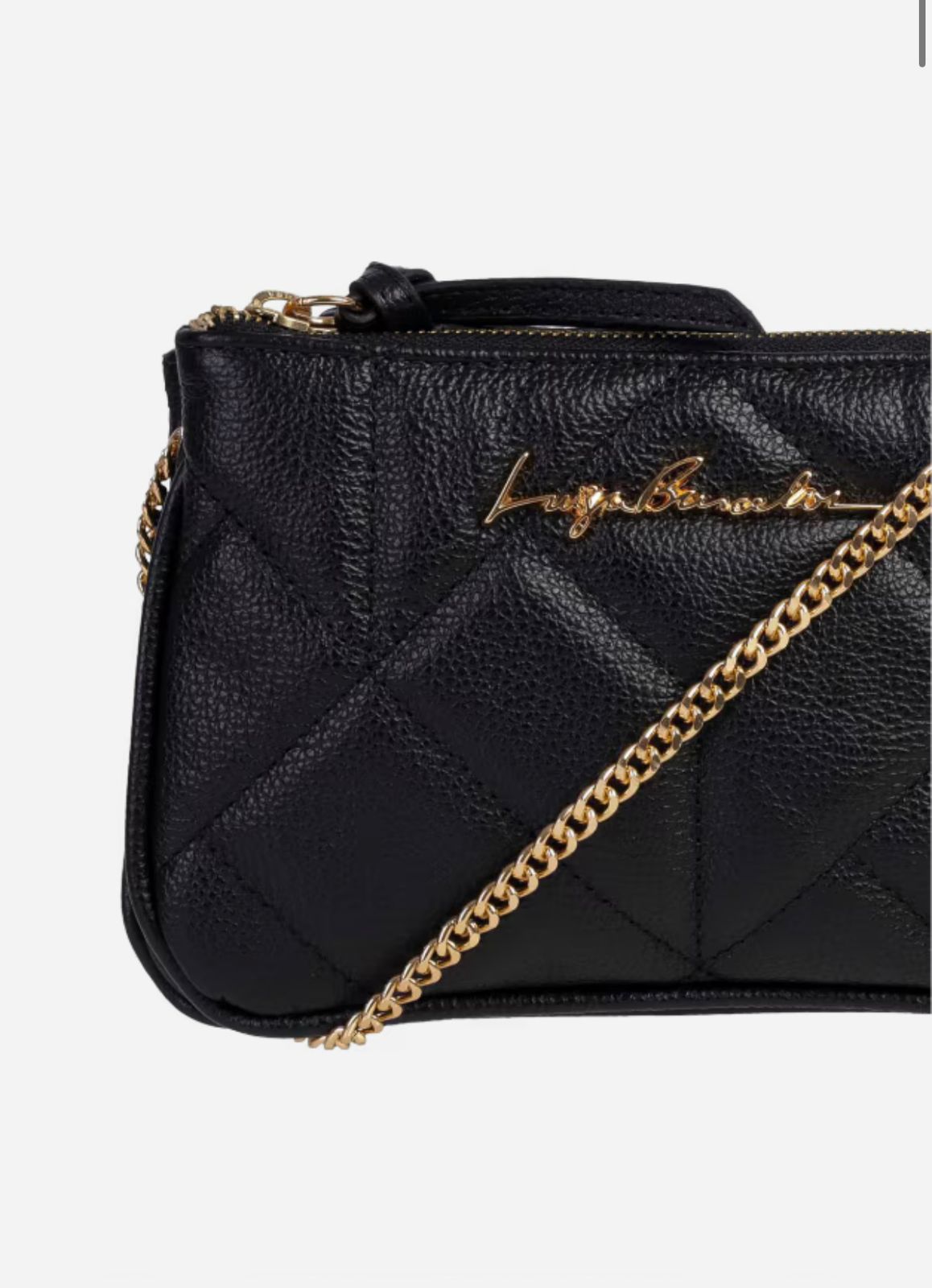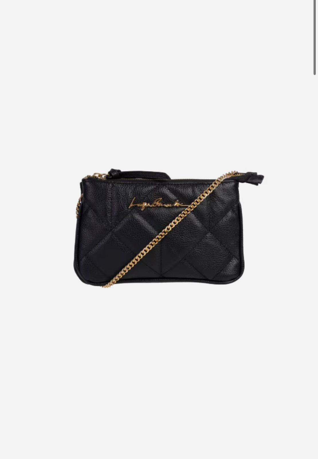 Charmosa e versátil, a bolsa tiracolo com alça de corrente Luiza Barcelos é uma das peças favoritas para o dia a dia da mulher contemporânea. O modelo é produzida em couro no tom preto, acabamento em matelassê, possui dois compartimentos com zíper, logo metálica aplicada no painel frontal e alça fina em correntes.