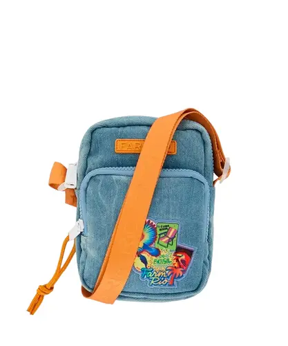 Bolsa pequena no formato retangular, confeccionada em tecido resistente na cor azul, com acabamento acolchoado. Possui alça longa ajustável em tom laranja, permitindo o uso transversal (crossbody). Conta com fechamento em zíper, garantindo praticidade e segurança para os itens essenciais. Na parte frontal, traz patches coloridos com temática tropical, característica marcante da Farm, que adicionam um visual descontraído e moderno. O logo da marca aparece discretamente na parte superior.