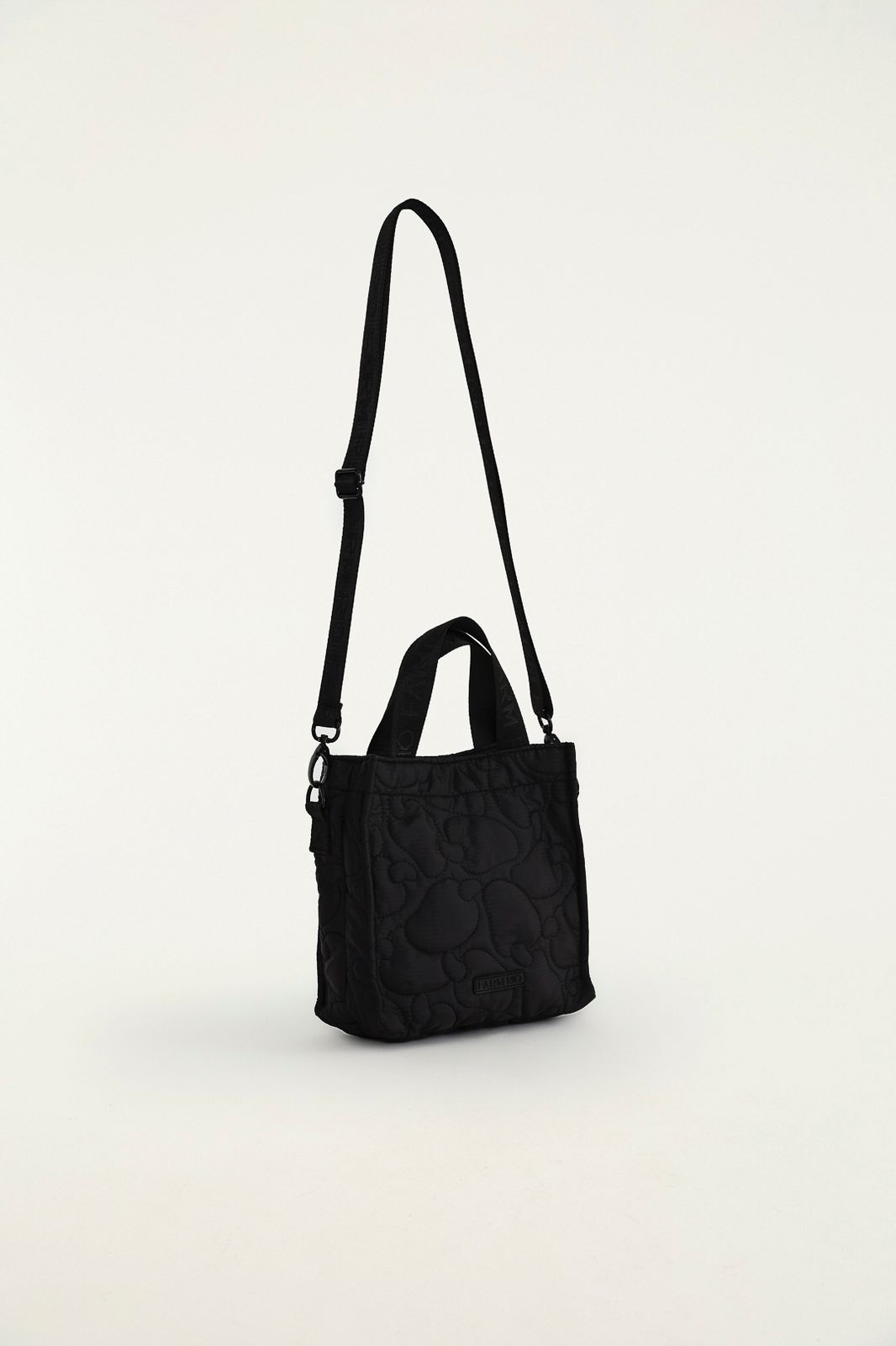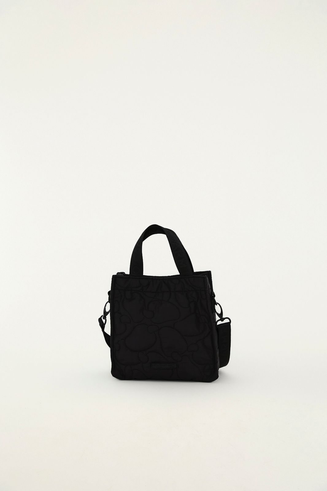 – Cor e material: bolsa preta de tecido liso com um padrão em relevo de círculos estilizados em toda a superfície.