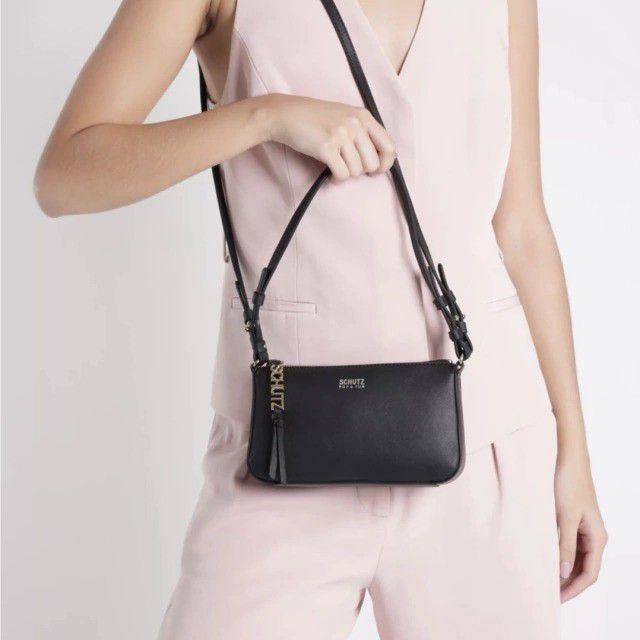 Essa bolsa Schutz em couro preto combina sofisticação e versatilidade em um design atemporal. Confira os principais detalhes: