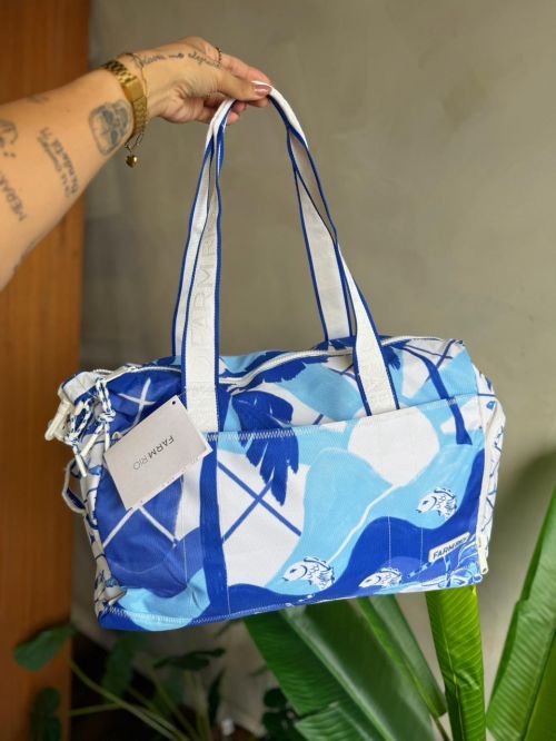 – Design: estampa azul com um padrão artístico de ondas e elementos gráficos inspirados em mural, remetendo à “Semana de Arte”.