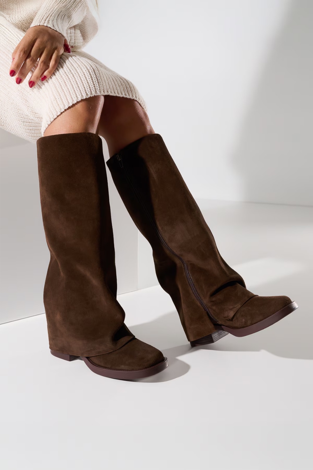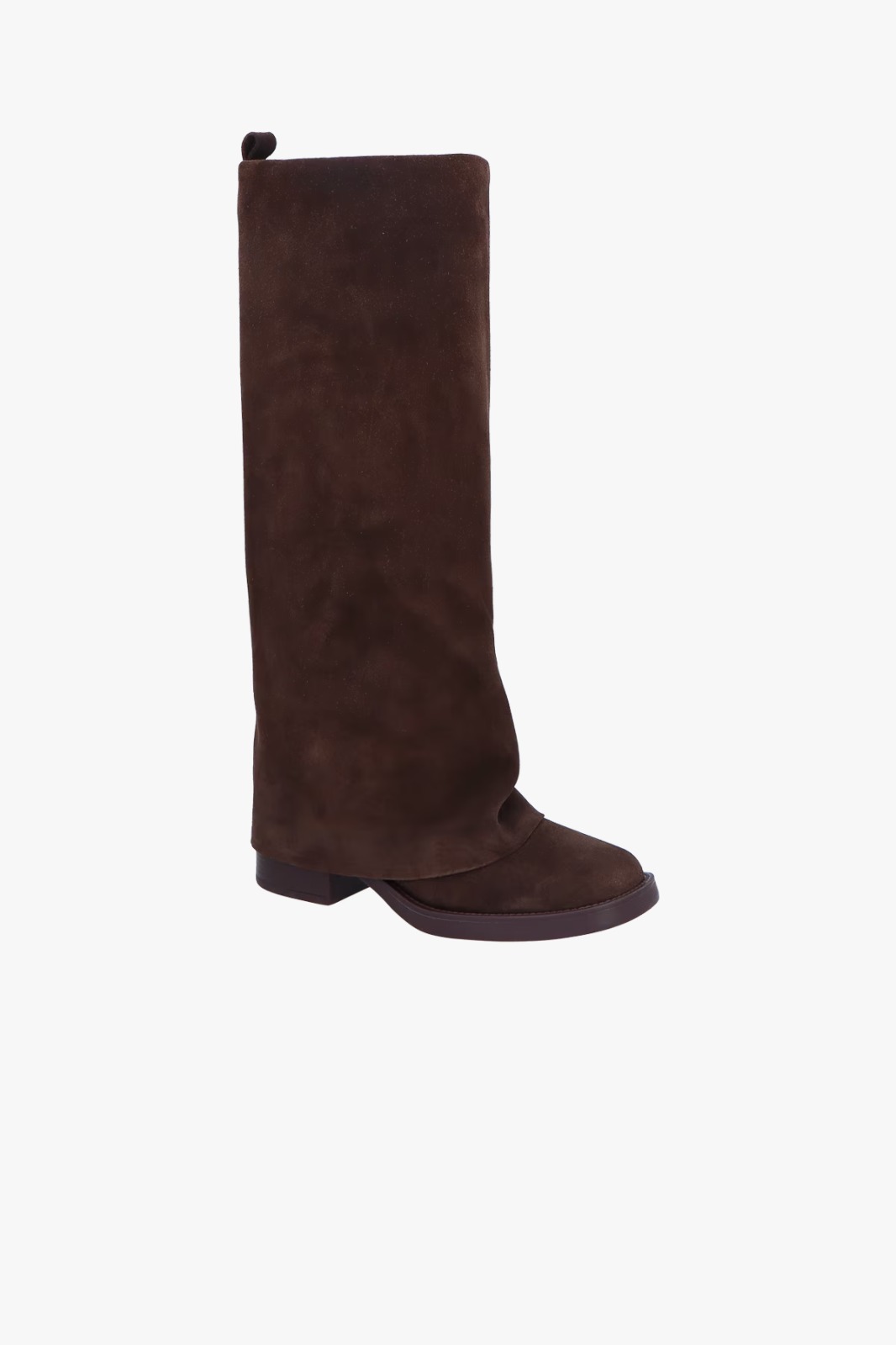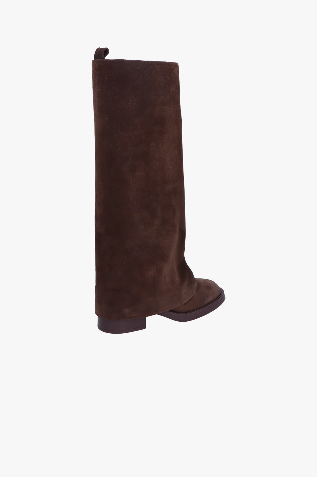NOME: BOTA DE CANO ALTO EM CAMURÇA CAFÉ SOBREPOSTO ESTILO CAPUZ