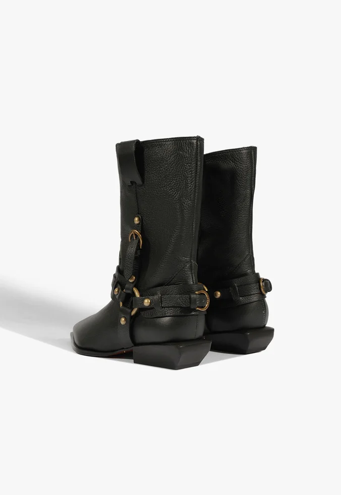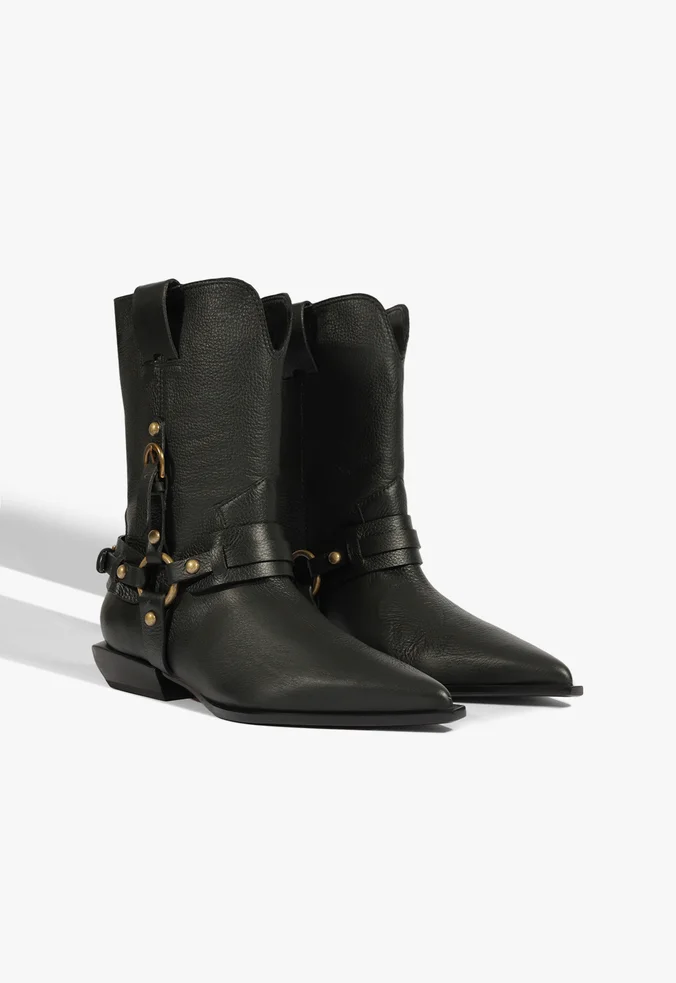 Essa bota é o match perfeito entre estilo e atitude! Feita em couro, ela traz um toque western com detalhes laterais de mix de couro e argolas de metal, deixando o visual ainda mais interessante. O bico fino e a vira aparente adicionam sofisticação, enquanto o salto bloco baixo e facetado garante aquele conforto estiloso para o dia todo.