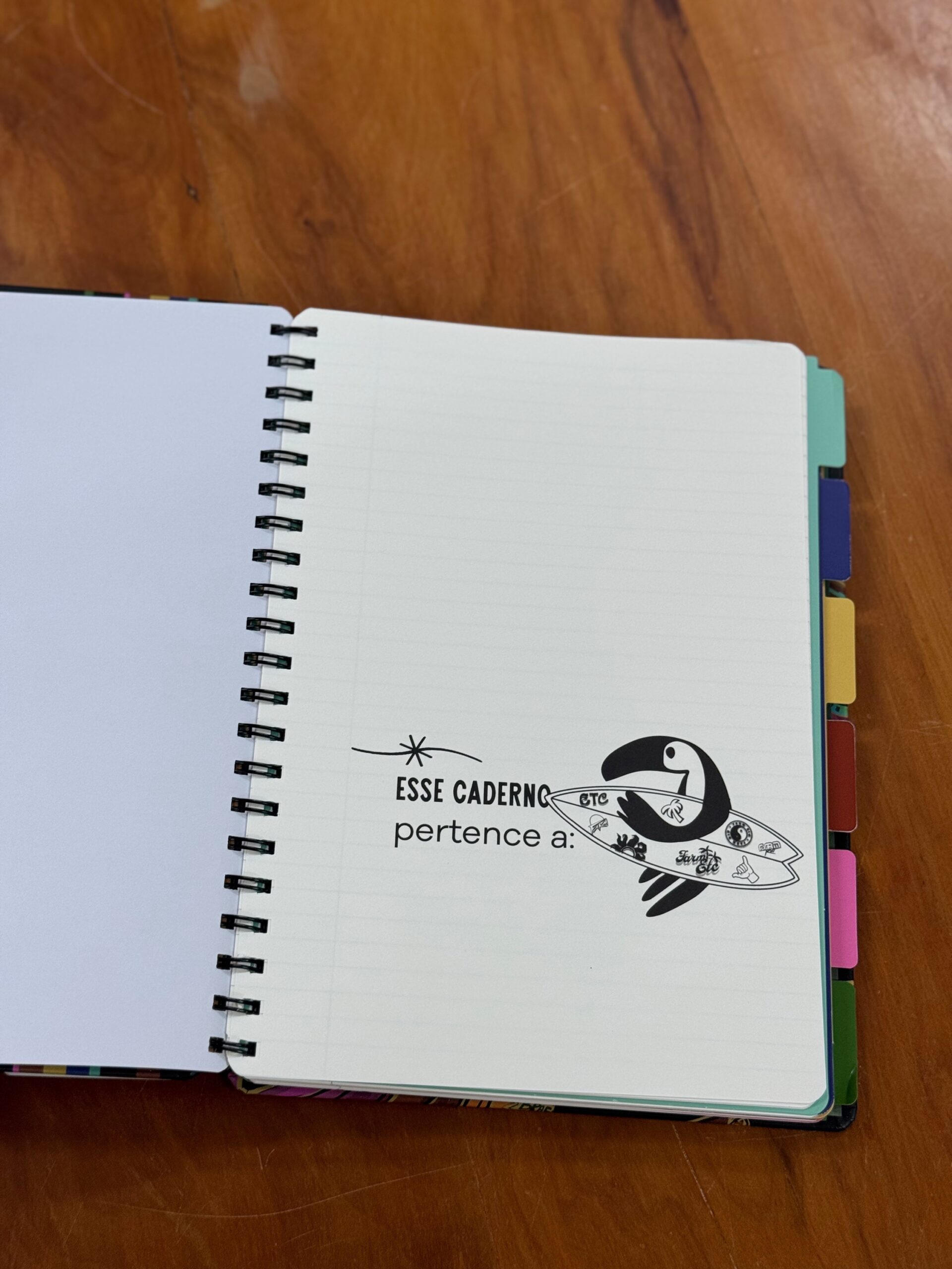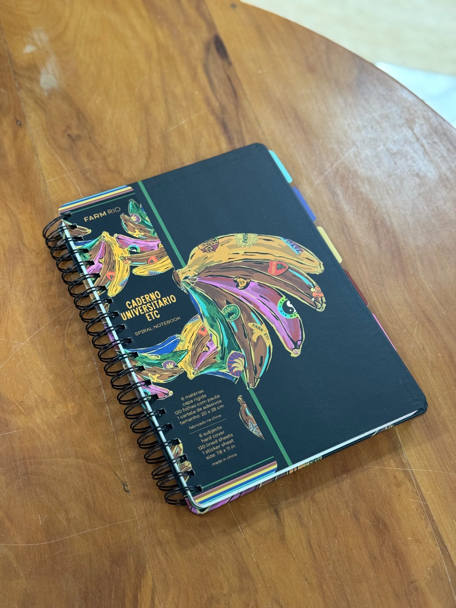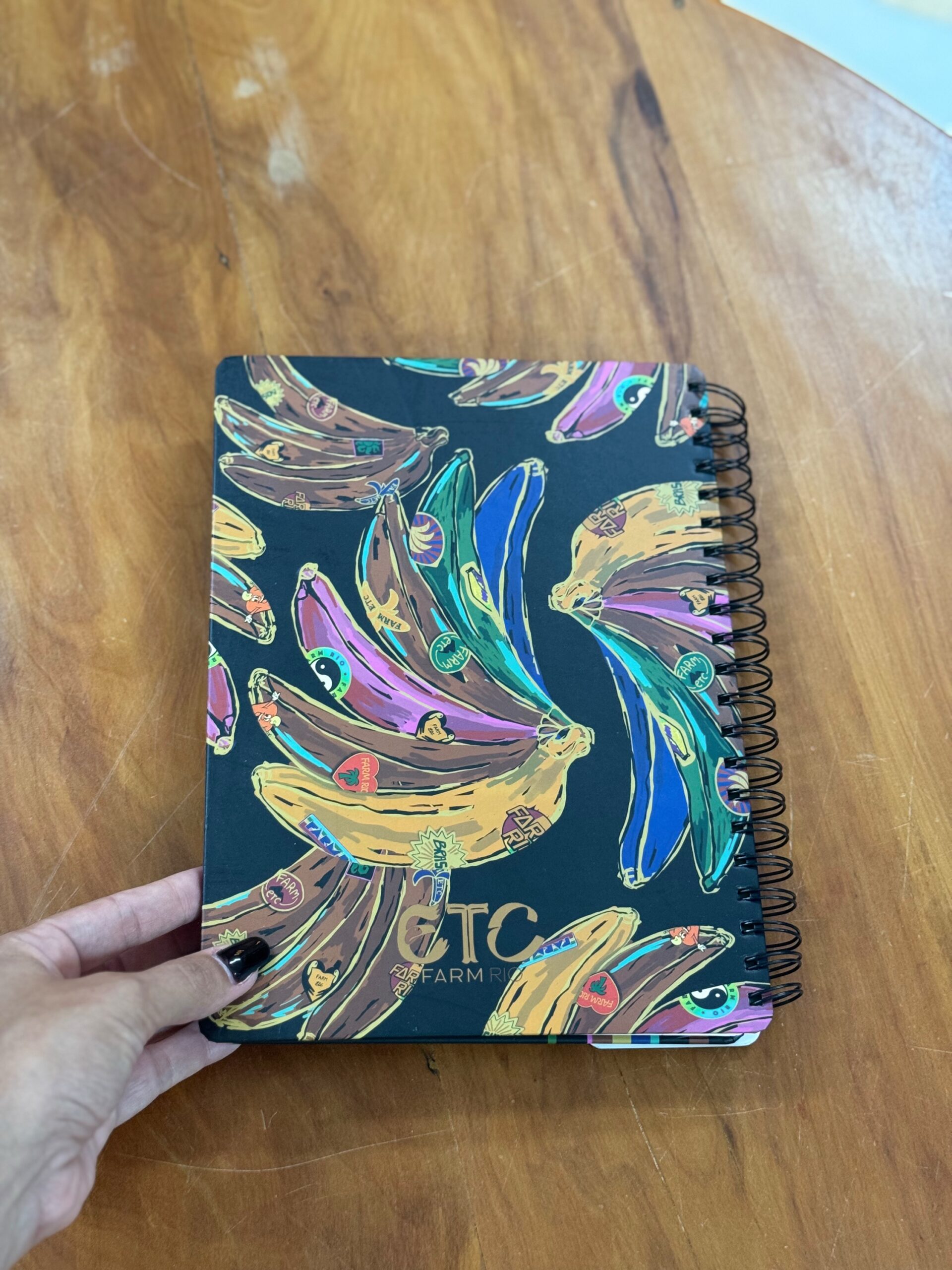 O caderno da Farm tem uma capa preta com ilustrações coloridas de bananas estilizadas em tons de marrom, azul, verde, rosa e amarelo, com detalhes em neon. O design apresenta o logo “ETC” em dourado na parte inferior, acompanhado do texto “FARM RIO” em letras menores. A capa é protegida por um plástico transparente.