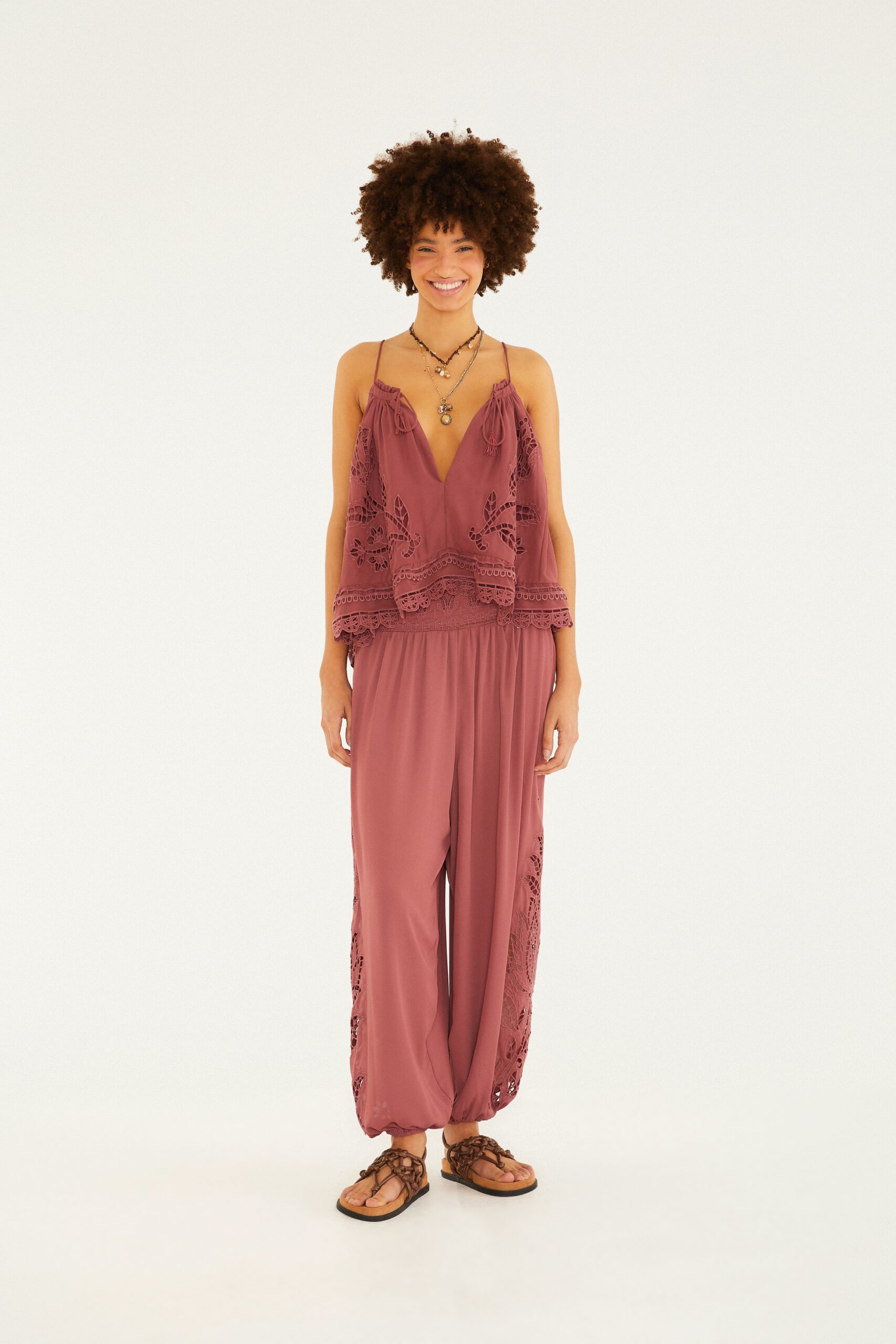 calça aladim richelieu tulipas. modelagem fluida e confortável com bordados richelieu que enchem de charme. cintura com elástico ajustável e barra afunilada garantem estilo e versatilidade. perfeita para momentos casuais e finais de semana despreocupados. FARM Rio, coleção Carioca – inverno 26.
