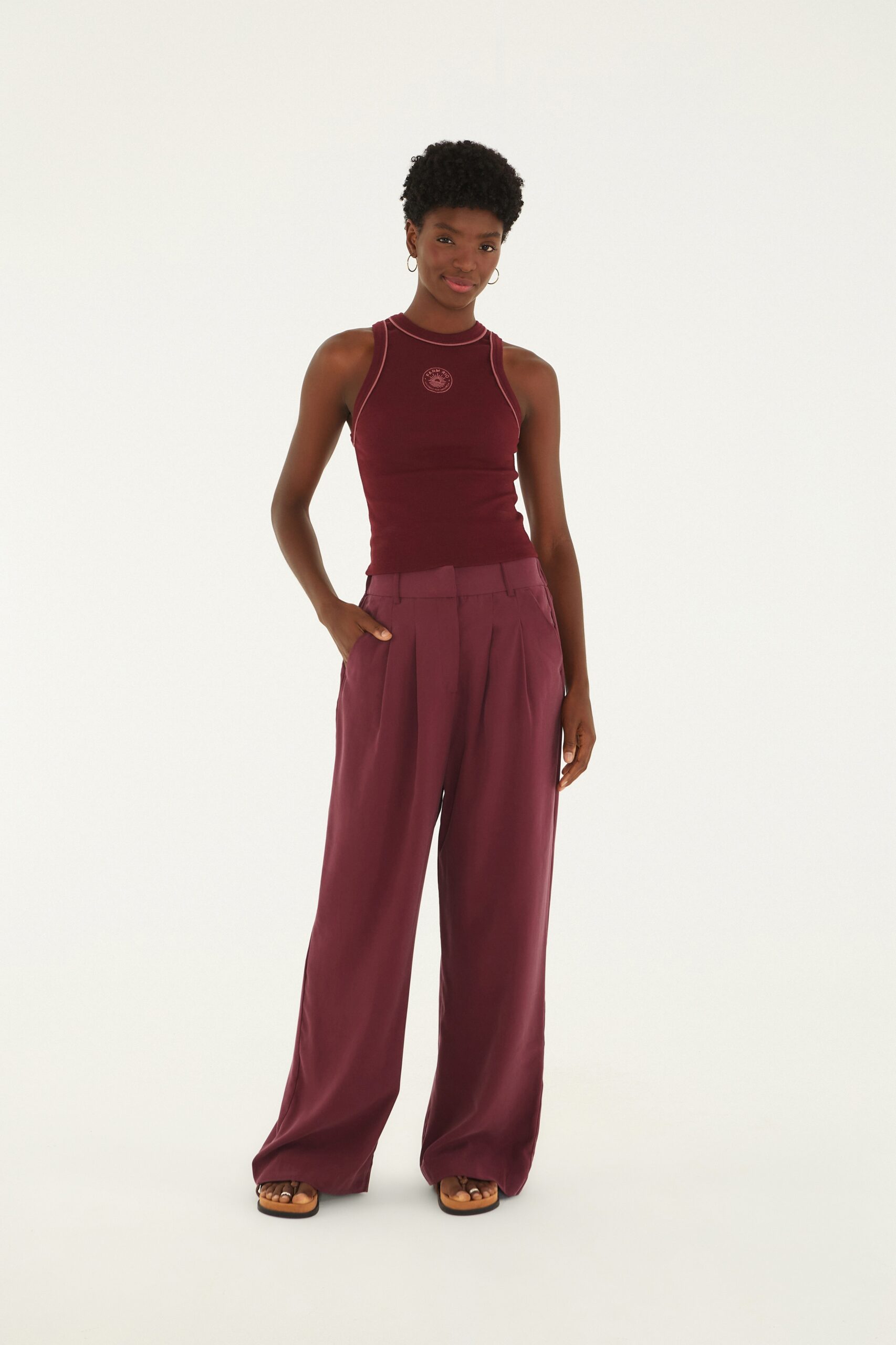 calça alfaiataria. modelagem impecável, cintura alta e corte amplo que proporciona movimento e liberdade. a barra alongada traz um toque de originalidade, enquanto o cós com elástico garante conforto e ajuste perfeito. ideal para um dia no escritório ou momentos descontraídos com estilo. FARM Rio, coleção Carioca – inverno 26.