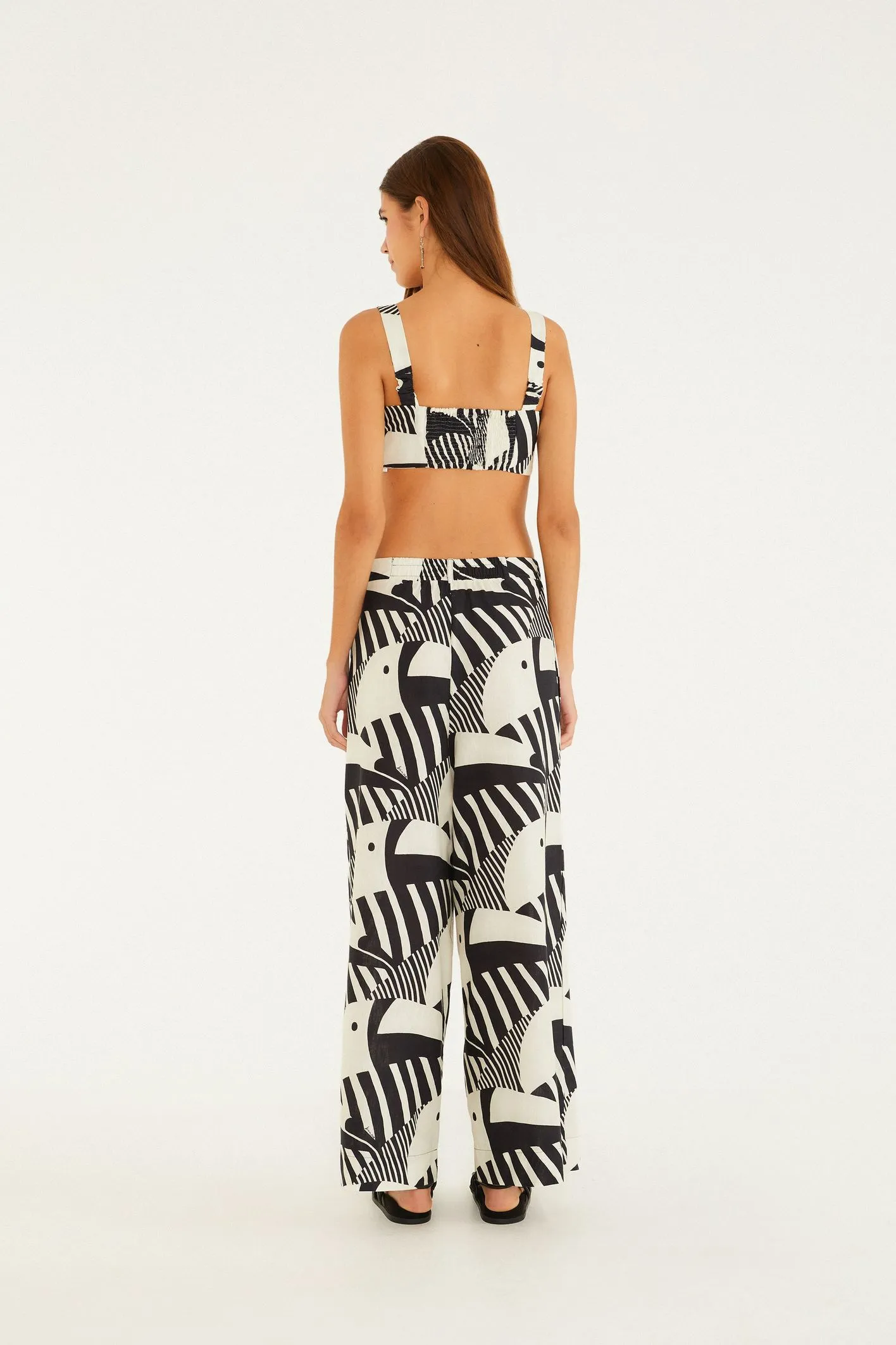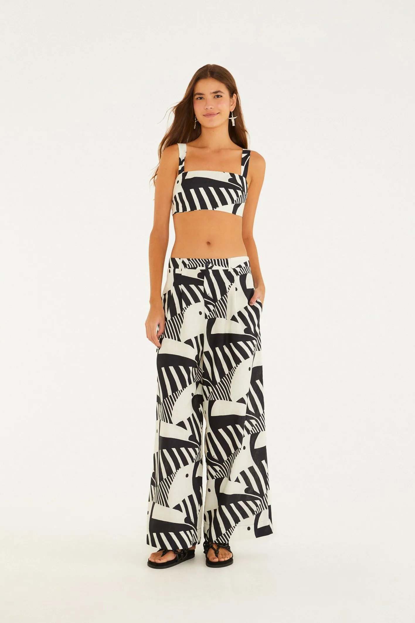 calça tuca legal. com modelagem ampla e caimento fluido, a peça propõe leveza e movimento a cada passo. cintura alta com passantes para cinto, é perfeita para combinações desde o casual até o mais elaborado. um toque de originalidade e conforto para transformar o seu dia. FARM Rio, coleção Carioca – inverno 26.