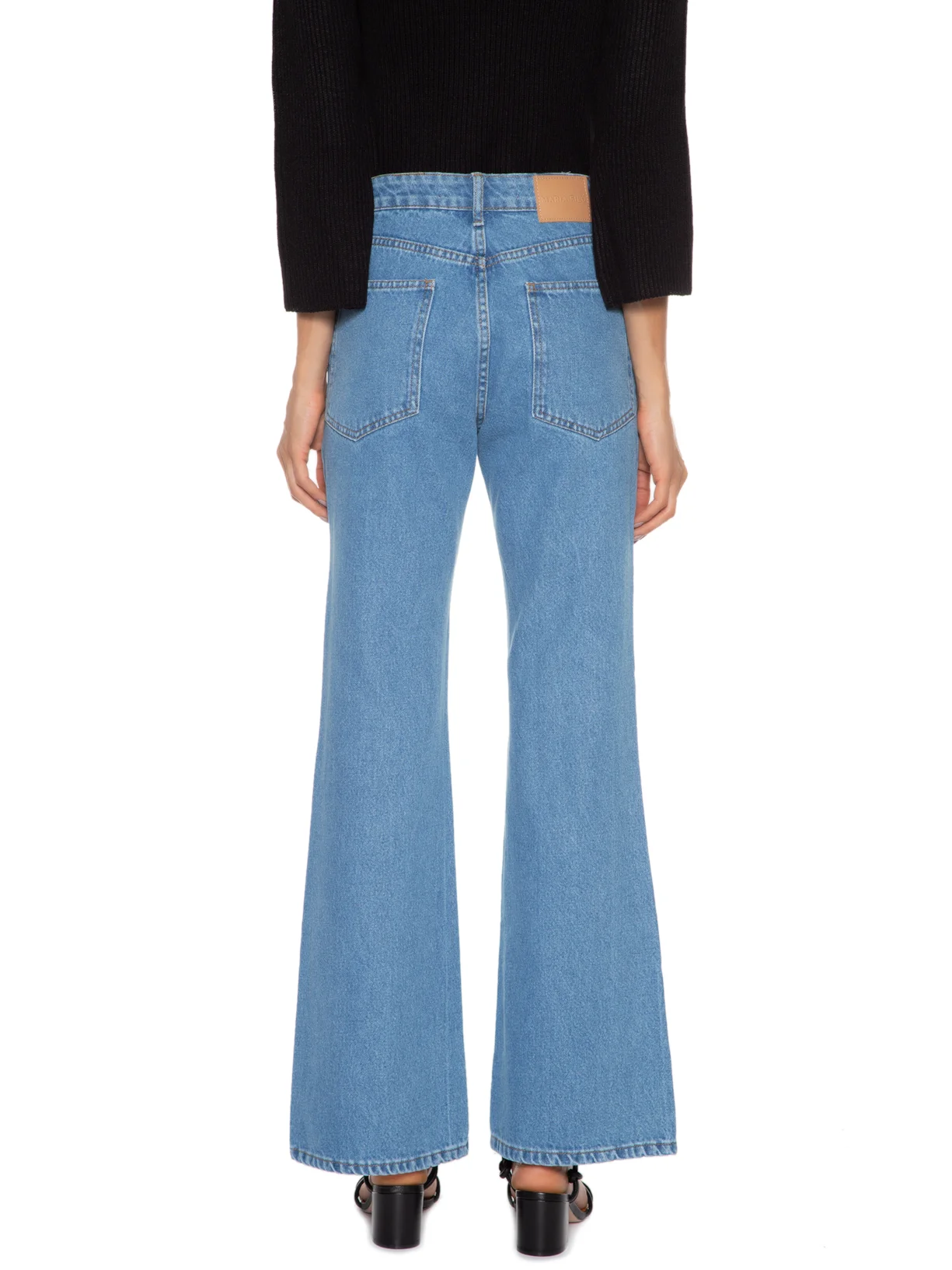 A calça azul é confeccionada em sarja com lavagem em jeans. A peça de modelo wide leg* possui cintura alta, passantes aplicados no cós, five pockets*, tag da marca aplicada na parte posterior, shape solto, caimento reto, acabamento pespontado e fechamento frontal por zíper e botão.