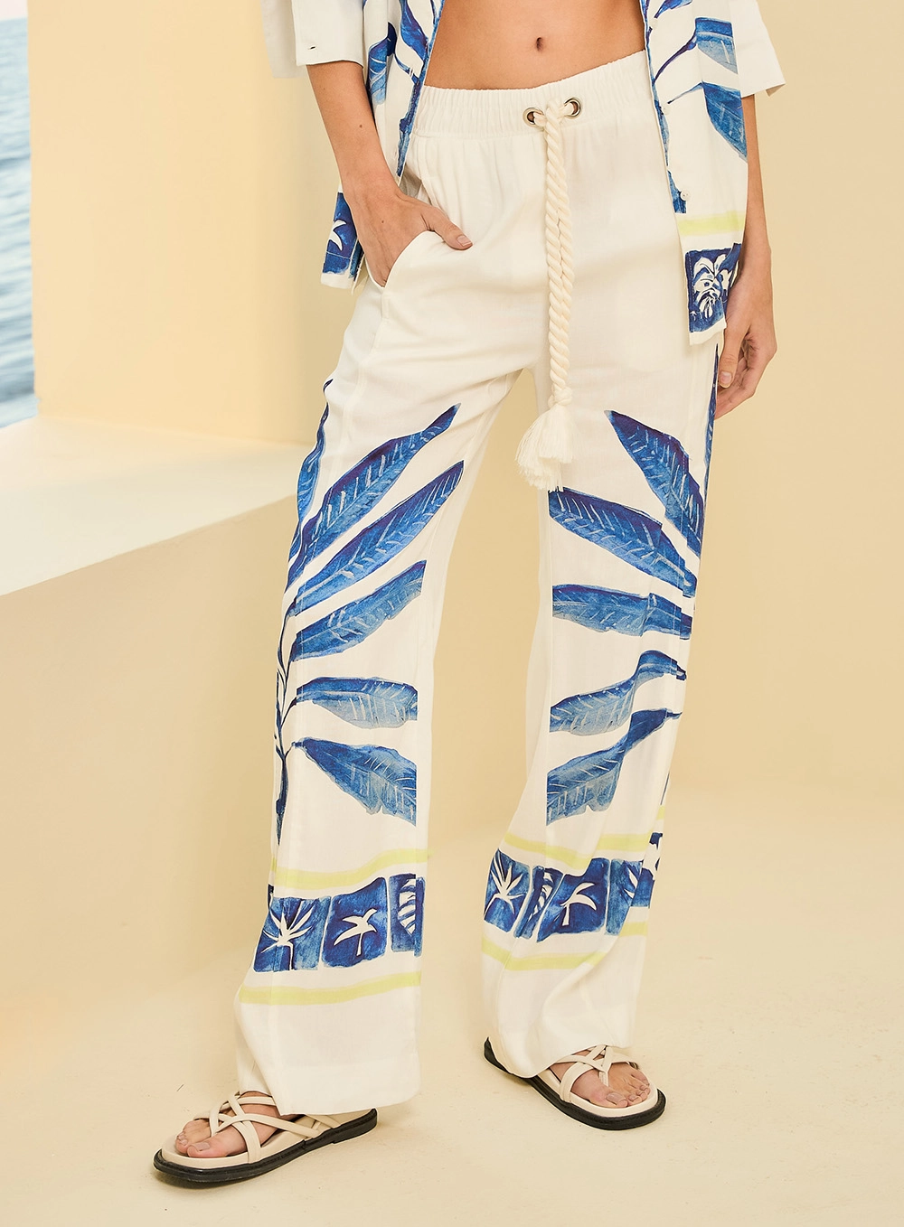 Como uma obra de arte que resgata a beleza da natureza, esta calça é a melodia que nos reconecta com a nossa origem. A estampa de folhagem, com seus traços que remetem ao handmade, é um convite para recarregar as energias com a vibração do mar e o calor do sol. É a peça perfeita para quem busca um futuro vibrante, reafirmando novas e sofisticadas formas de ser e existir.