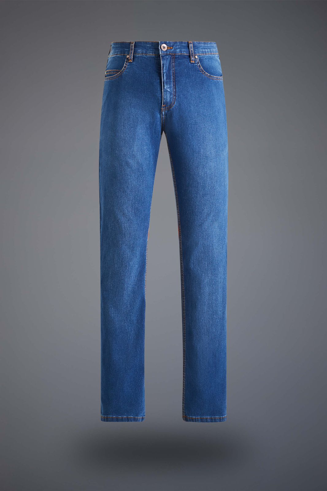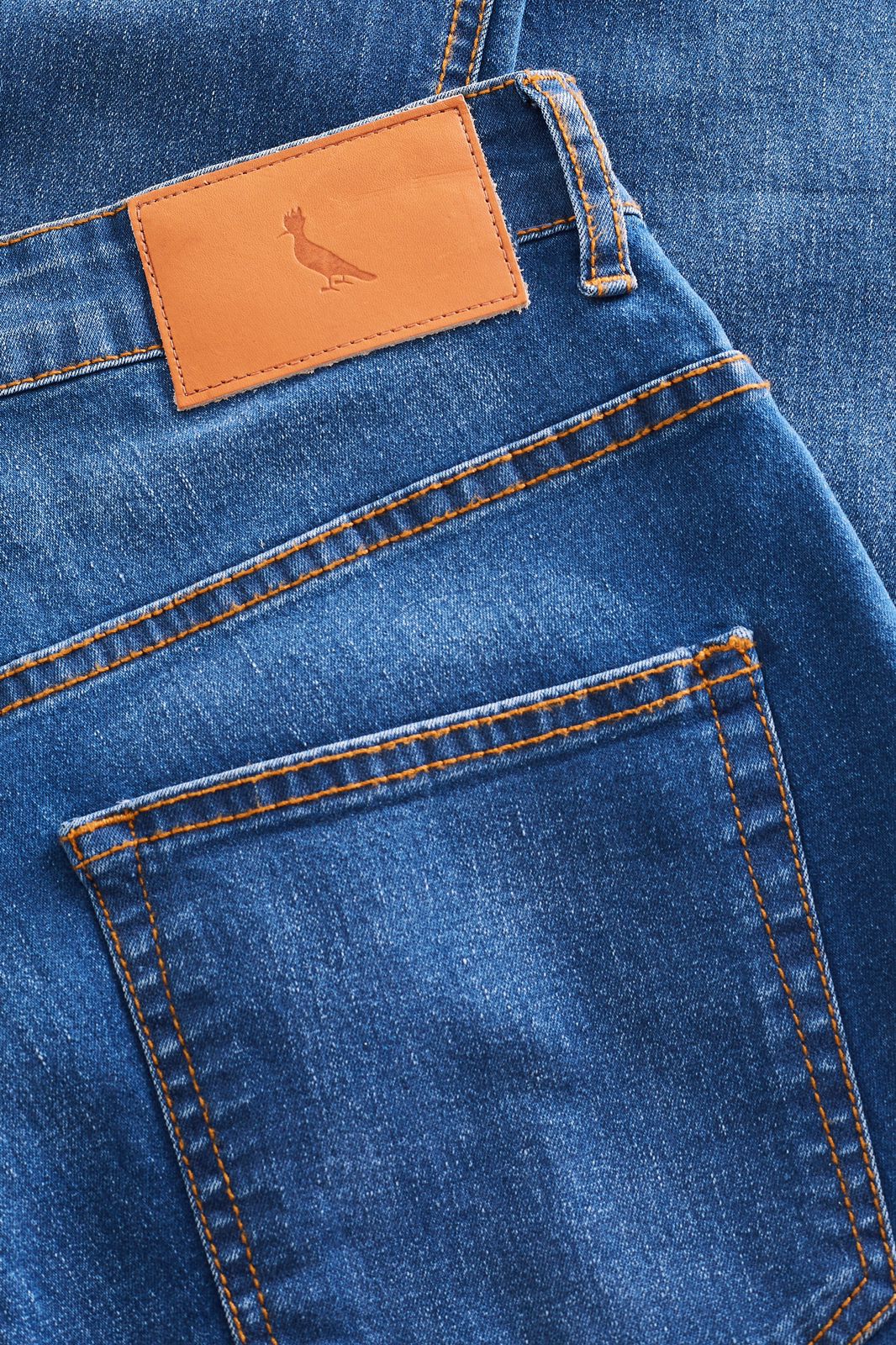 Detalhes: cinco bolsos (dois frontais, um bolso relógio e dois traseiros), costuras em tom caramelo contrastando com o jeans.