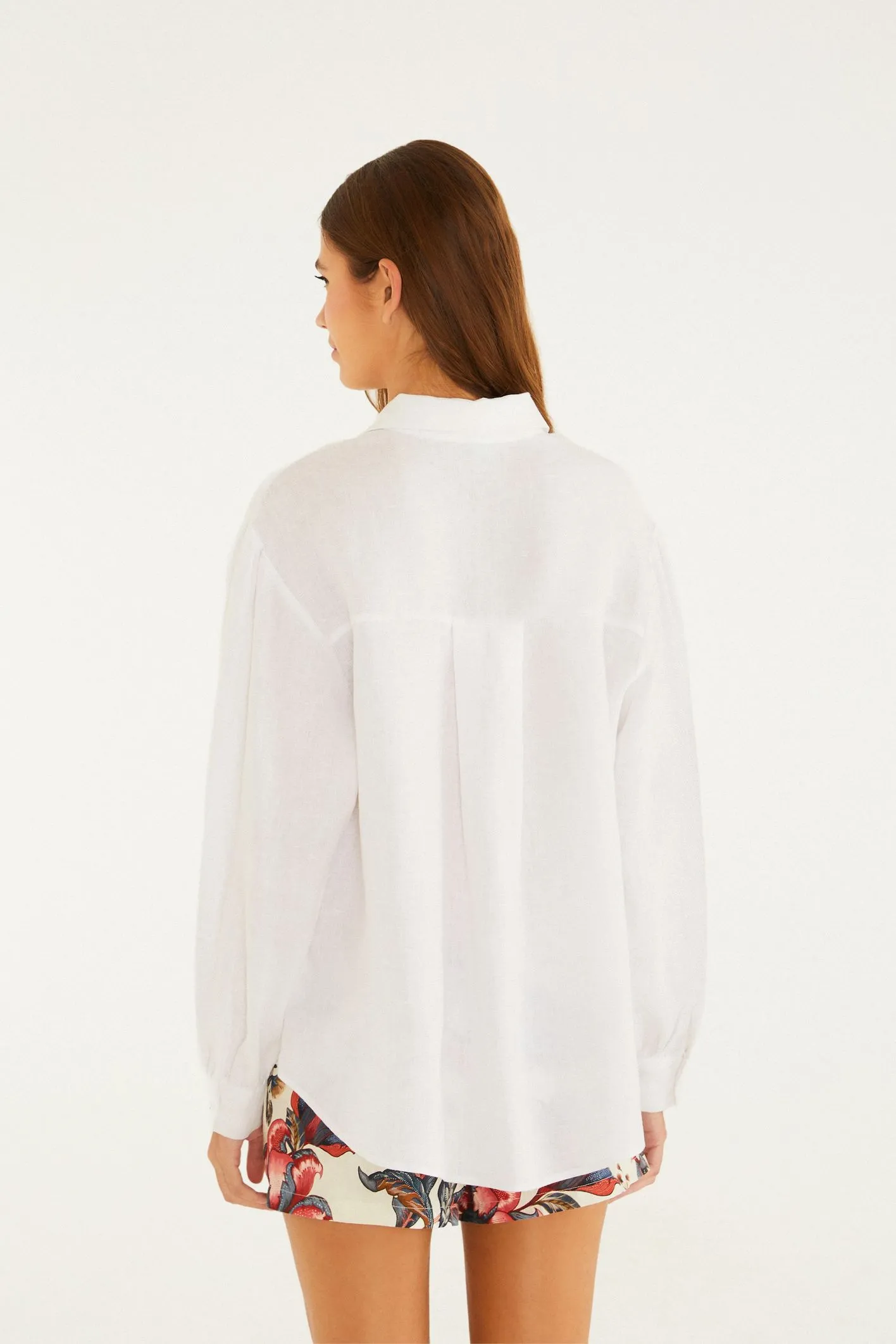 camisa mangas linho. confeccionada com tecido natural, tem corte levemente solto e mangas longas com botões nos punhos, garantindo um visual casual e moderno. a gola clássica e o abotoamento frontal elevam a peça, tornando-a ideal para reuniões de trabalho ou passeios diurnos. FARM Rio, coleção Carioca – inverno 26.