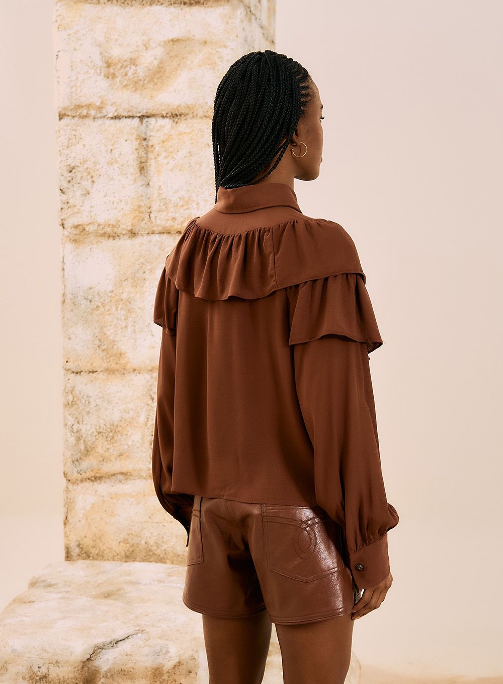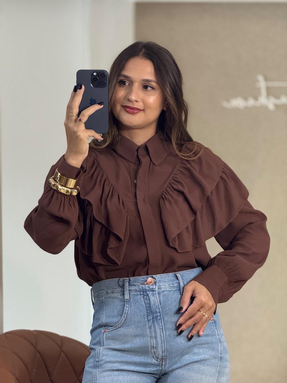 COMO É:Peça: Camisa sofisticada com babados e detalhe de botão na gola, trazendo um toque romântico e elegante ao visual.