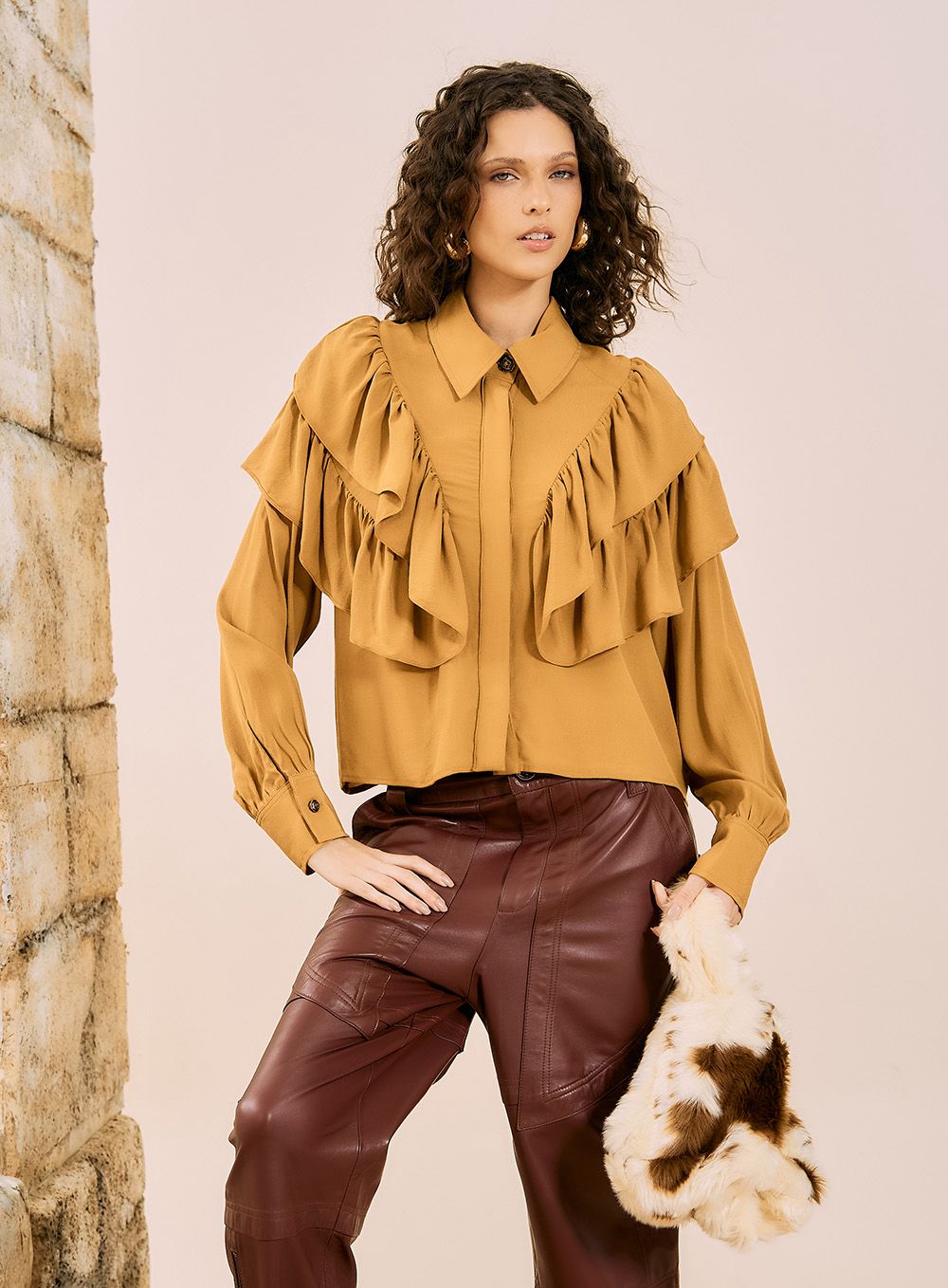 Detalhes: Babados aplicados na parte frontal e nas costas, criando movimento e textura; fechamento frontal com botões ocultos para um visual clean.