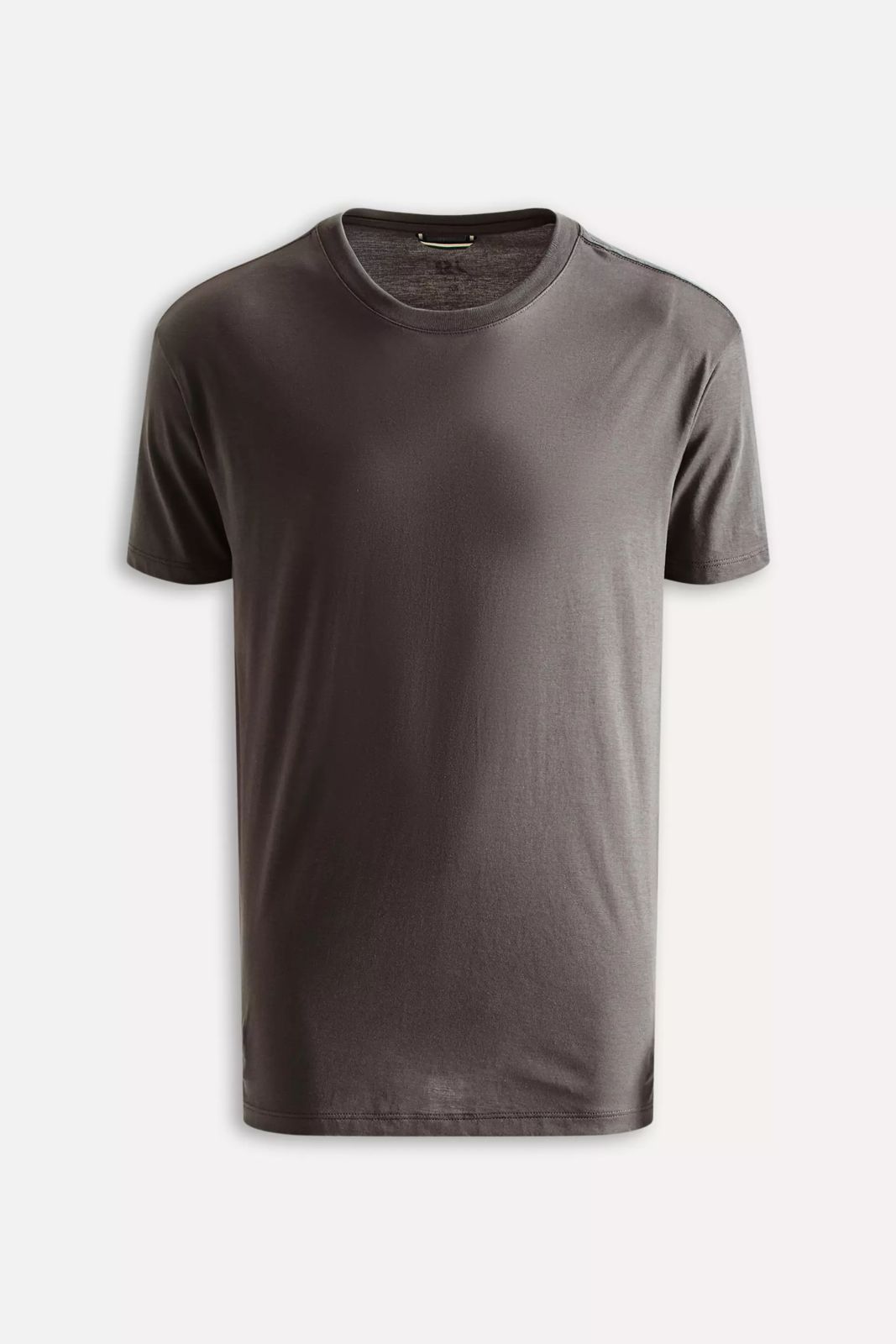 Camisa cinza escuro, manga curta, gola redonda, corte clássico. Material de boa qualidade, provavelmente algodão ou mistura. Marca Reserva. Design minimalista e versátil para uso casual ou semi-formal.
