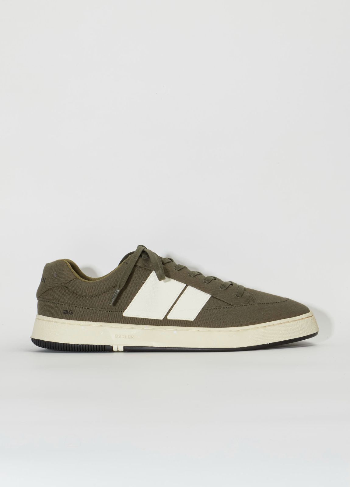 – Cor: parte superior em verde oliva (canvas) com duas faixas brancas em forma de “V” na lateral.