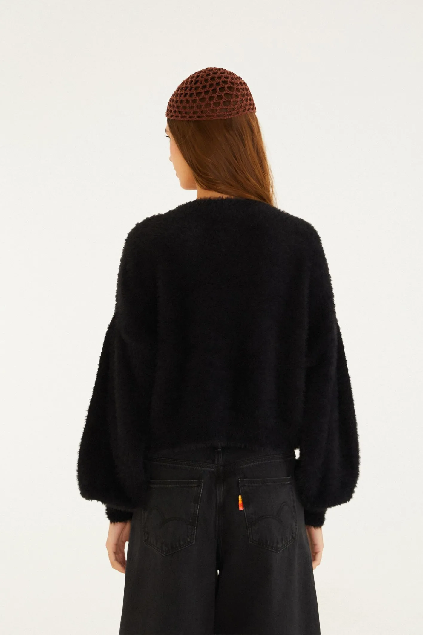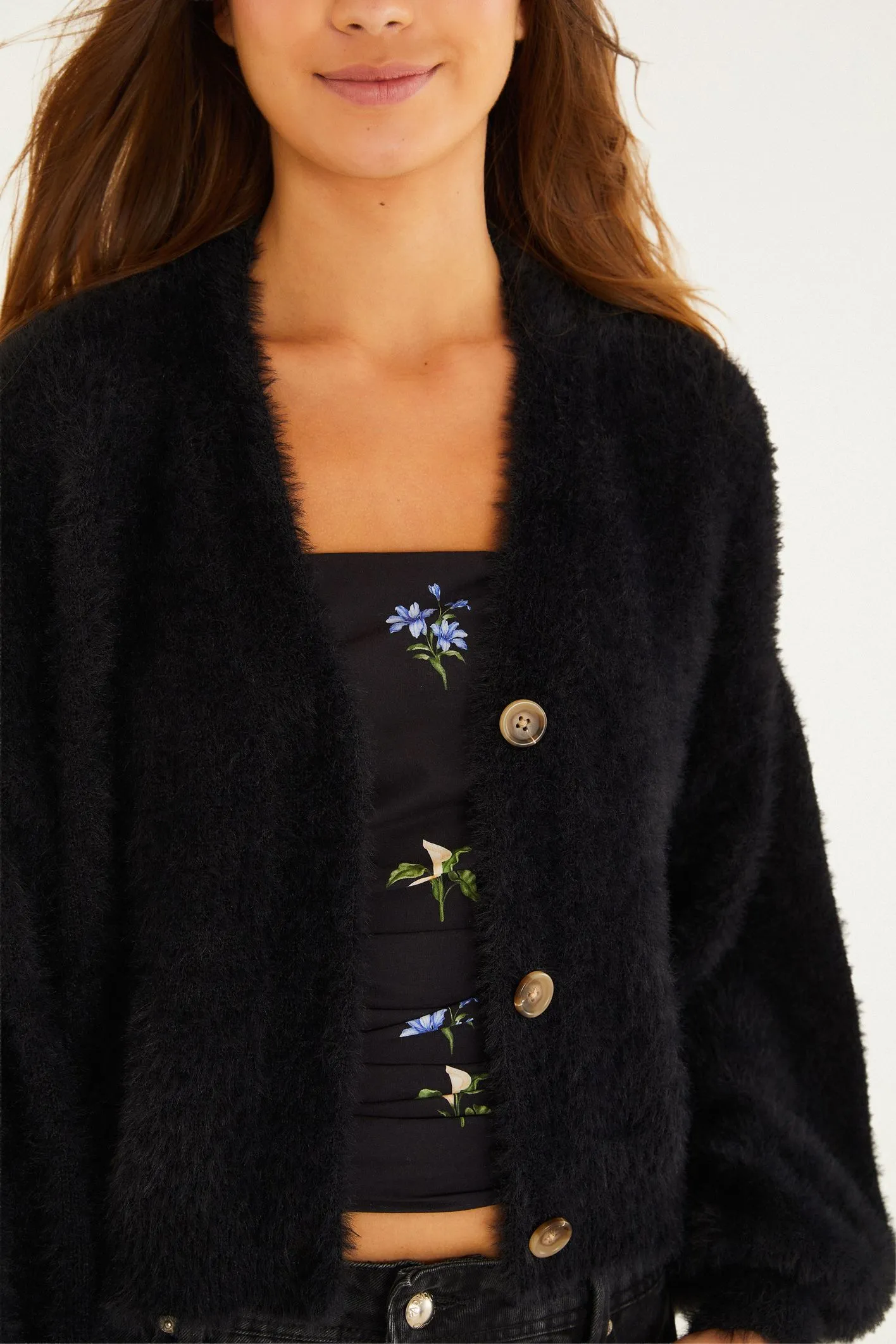 cardigan curto pelinho harmoniza conforto e estilo com modelagem soltinha que aquece em dias mais frescos. o detalhe dos botões frontais adiciona praticidade, enquanto as mangas longas com leve volume completam o visual casual. ideal para passeios ao ar livre ou encontros descontraídos. FARM Rio, coleção Carioca – inverno 26.