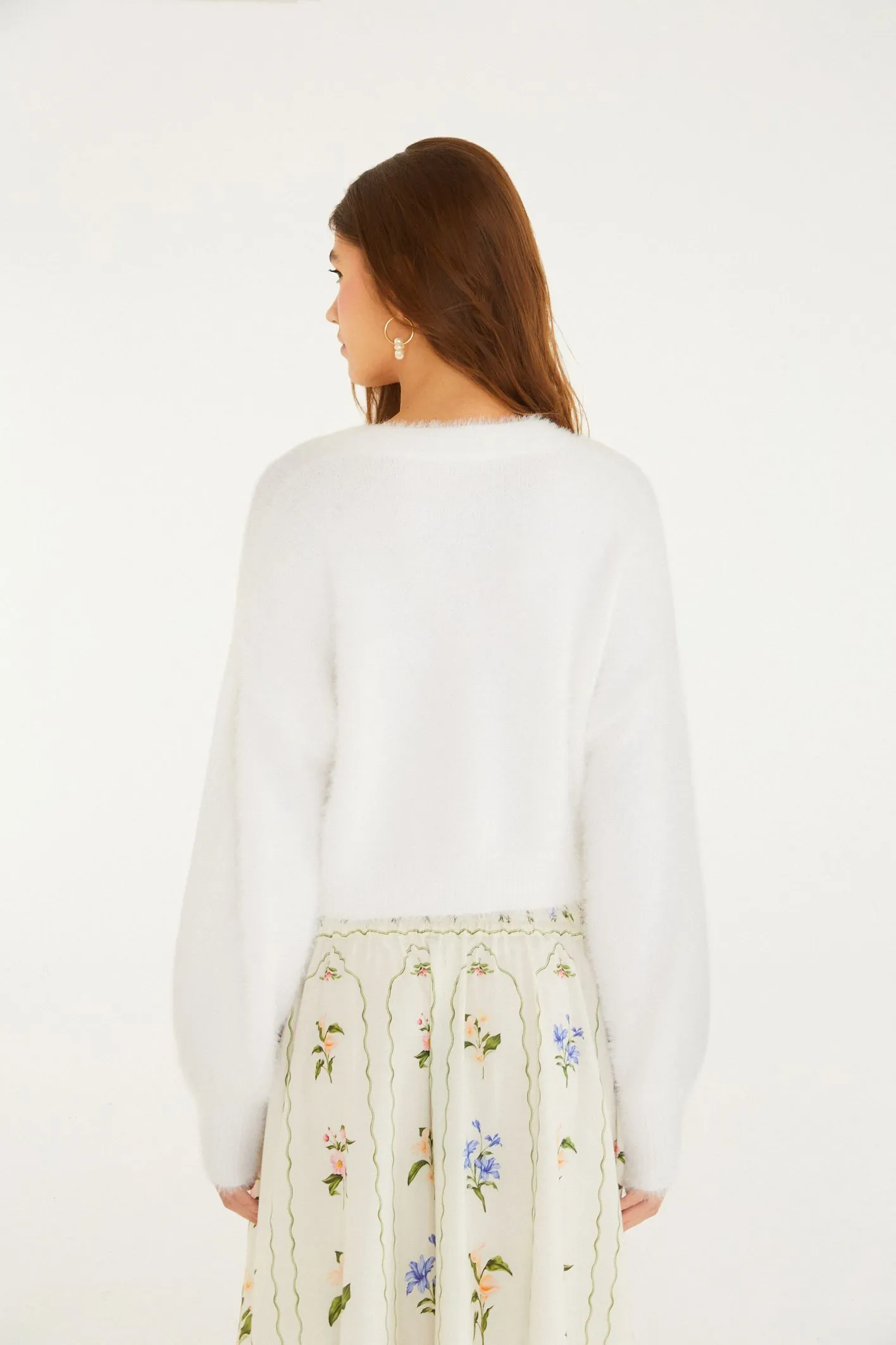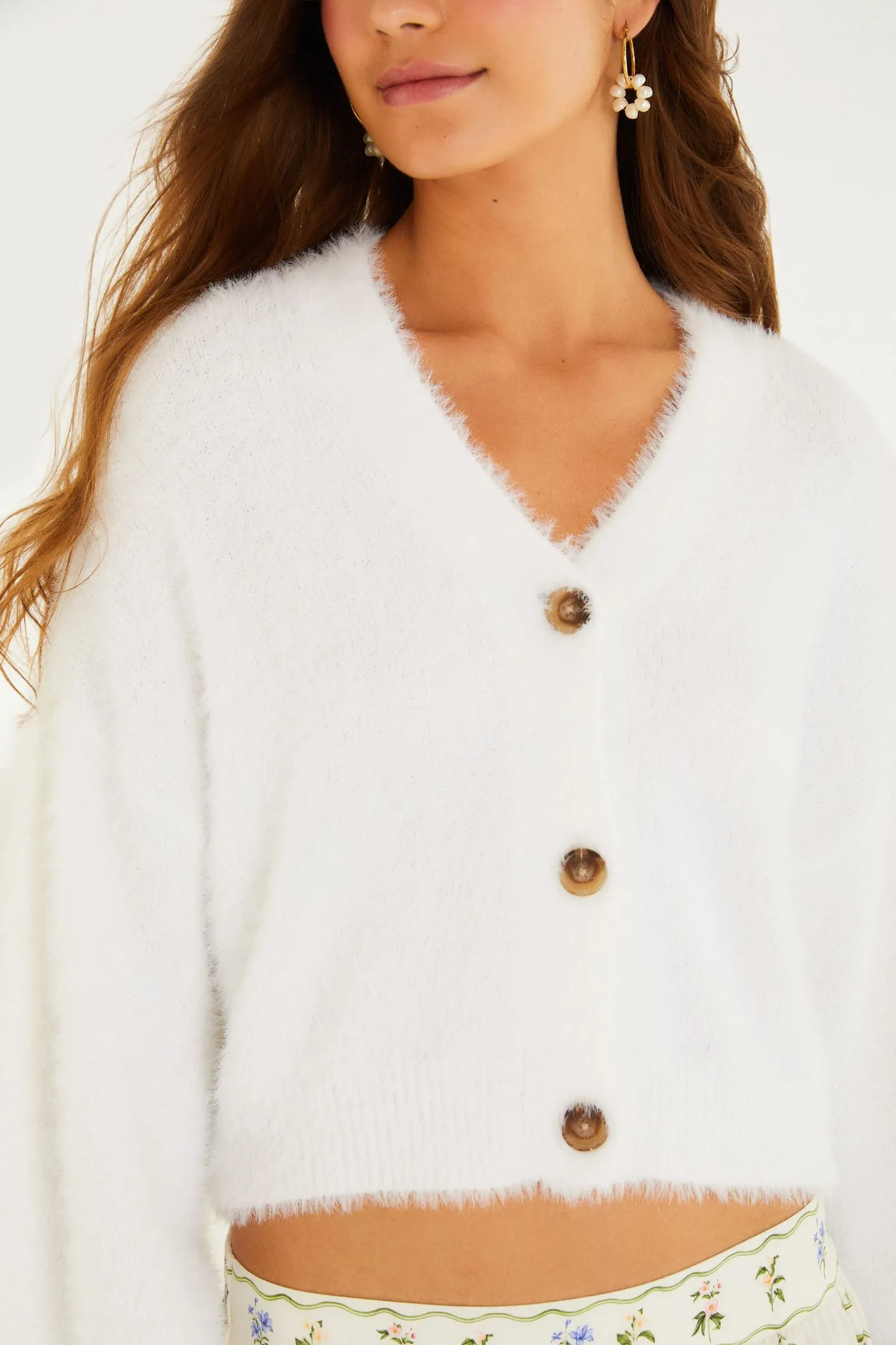 cardigan curto pelinho harmoniza conforto e estilo com modelagem soltinha que aquece em dias mais frescos. o detalhe dos botões frontais adiciona praticidade, enquanto as mangas longas com leve volume completam o visual casual. ideal para passeios ao ar livre ou encontros descontraídos. FARM Rio, coleção Carioca – inverno 26.