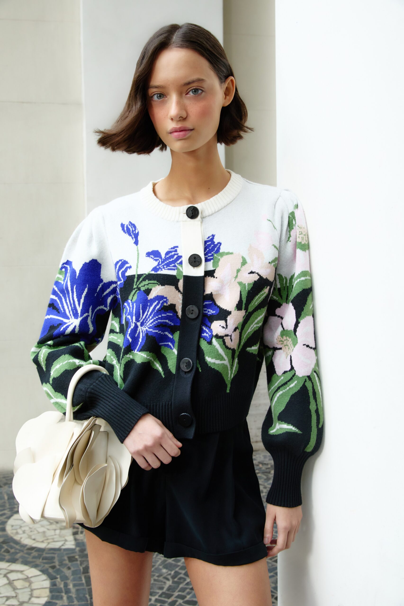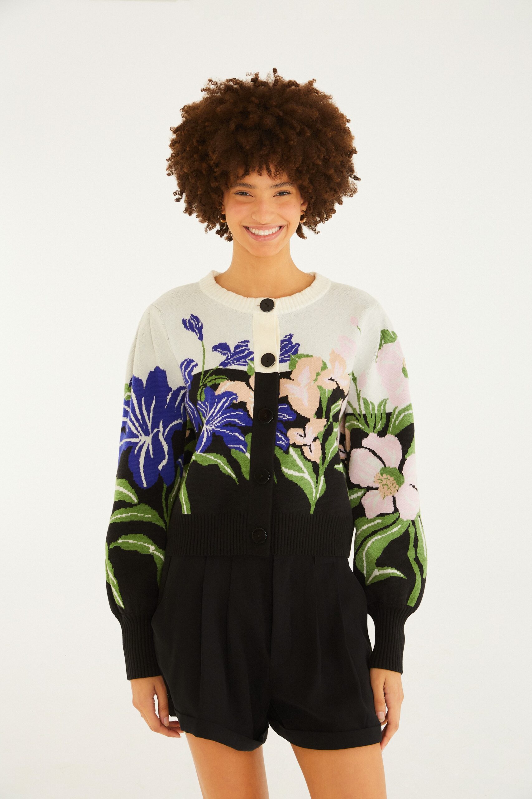 cardigan tricot céu de flor. com um corte clássico e toque macio, destaca-se pelas mangas longas abalonadas e os botões frontais que complementam o visual. ideal para aquecer os dias mais frescos, combinando perfeitamente com looks casuais ou para dar um toque especial nas reuniões de fim de semana. FARM Rio, coleção Carioca – inverno 26.