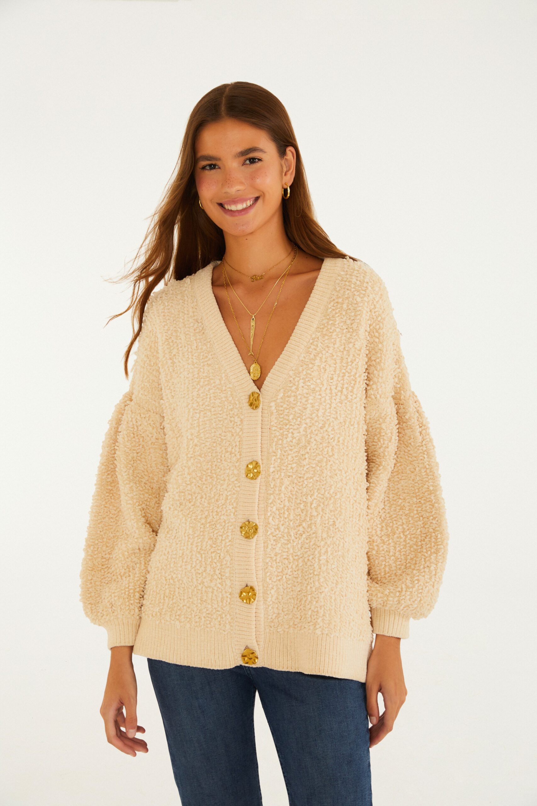 Ele é confeccionado em um tecido de tricô com textura tipo bouclé, que dá esse aspecto felpudo e macio. A cor é um bege/creme neutro, super versátil para combinar com várias peças.