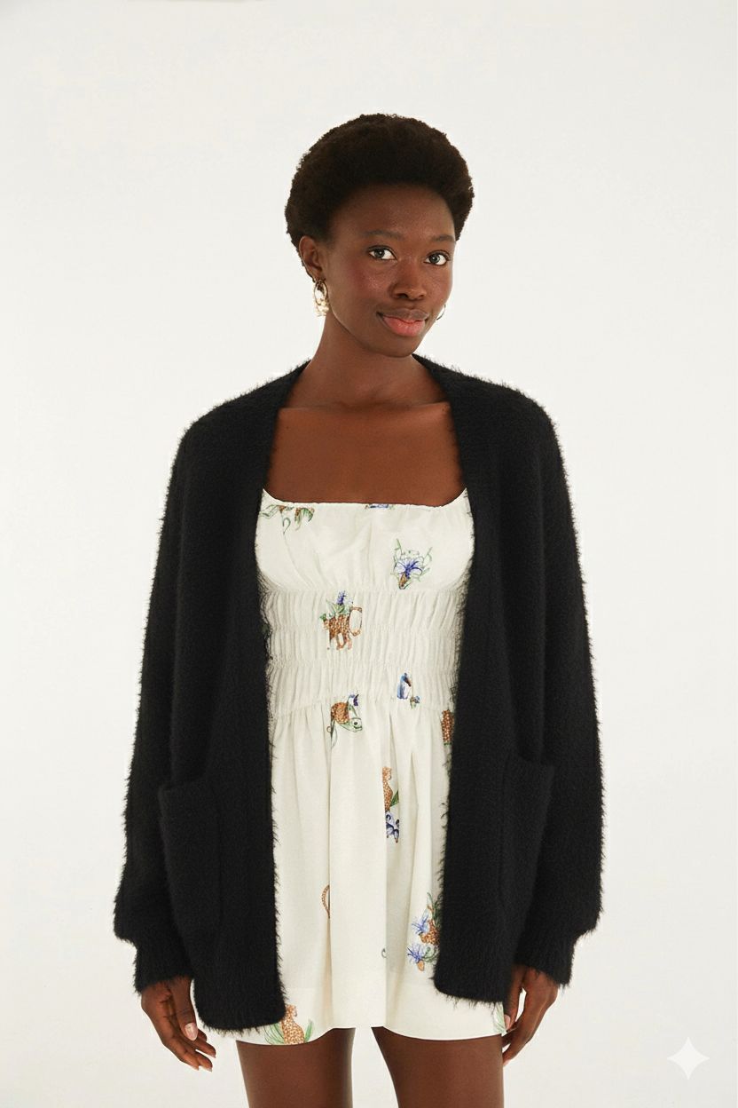 cardigan tricot pelinho com bolso. uma peça essencial, com toque macio e corte solto que garante conforto e estilo. o design inclui mangas longas e dois práticos bolsos frontais, ideal para um look casual no inverno. versátil, combina com qualquer ocasião, elevando qualquer produção. FARM Rio, coleção Carioca – inverno 26.