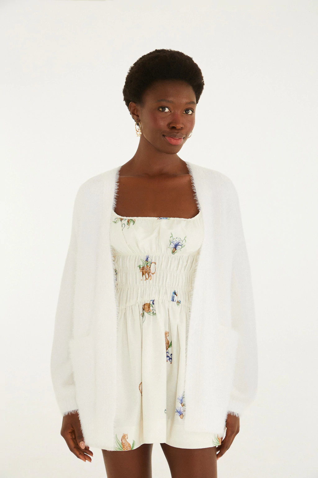 cardigan tricot pelinho com bolso. uma peça essencial, com toque macio e corte solto que garante conforto e estilo. o design inclui mangas longas e dois práticos bolsos frontais, ideal para um look casual no inverno. versátil, combina com qualquer ocasião, elevando qualquer produção. FARM Rio, coleção Carioca – inverno 26.