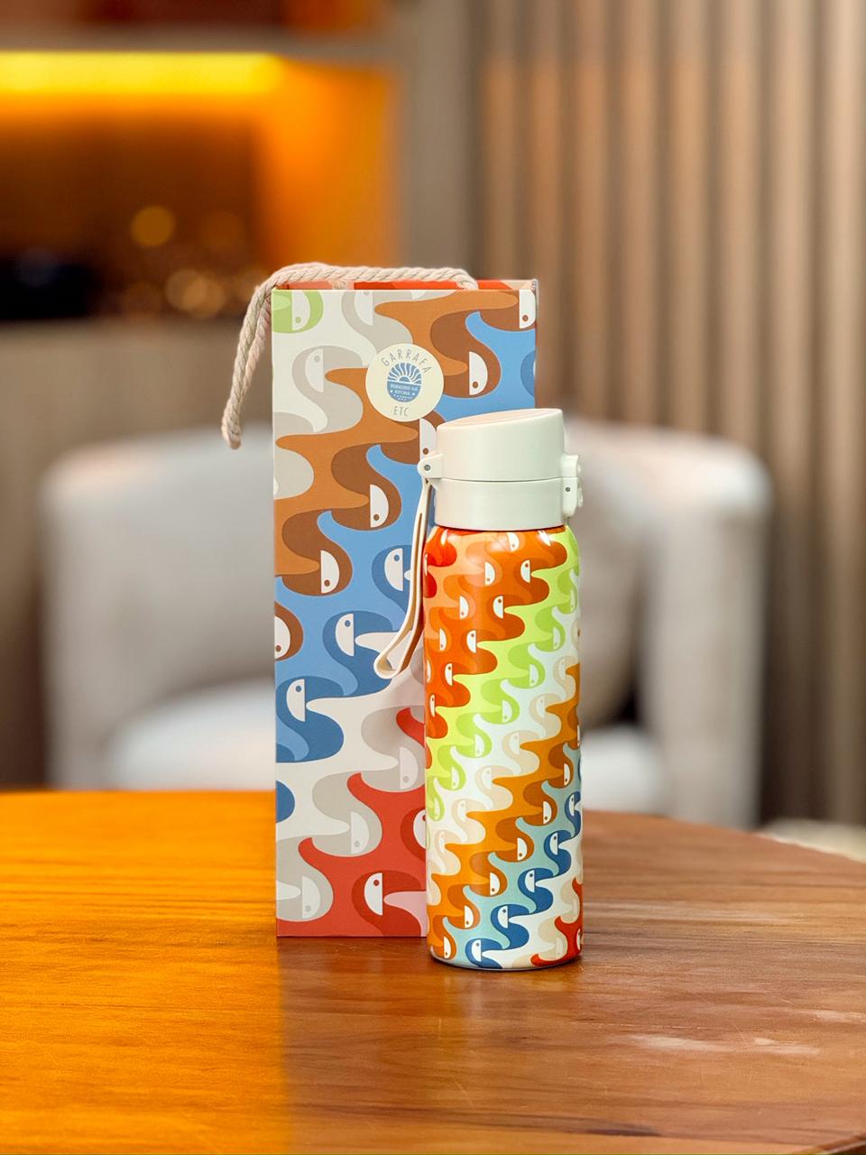 A garrafa Copa Tucano Oásis (também chamada de “Garrafa ETC 850ML Copatucano Multicolori”) é uma garrafa térmica com design colorido e estilizado, inspirado no tucano. Geralmente é feita de aço inoxidável ou material térmico que mantém bebidas quentes ou frias por horas. O modelo tem capacidade de 850 ml e apresenta um padrão multicolorido (vermelho, verde, laranja e azul) com estampa de folhas e formas orgânicas. O fechamento é com tampa e alça (corda) para transporte fácil.