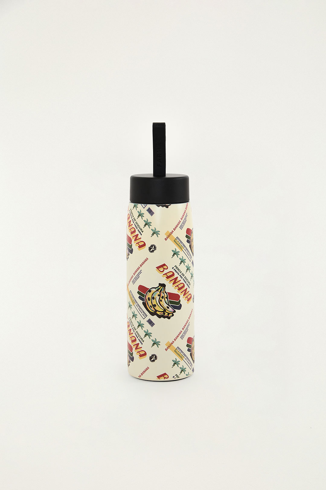 A garrafa “Banana da Feira” da Farm é um recipiente de 500 ml com um design colorido e alegre. Ela possui um corpo cilíndrico branco decorado com estrelas, linhas diagonais e um logotipo central com uma banana estilizada e o texto “BANANA”. O tampa é preta com um canudo integrado, ideal para levar bebidas na seden (sede, provavelmente um erro de digitação). O produto parece ser uma opção prática e divertida para matar a sede, especialmente em eventos ou feiras.