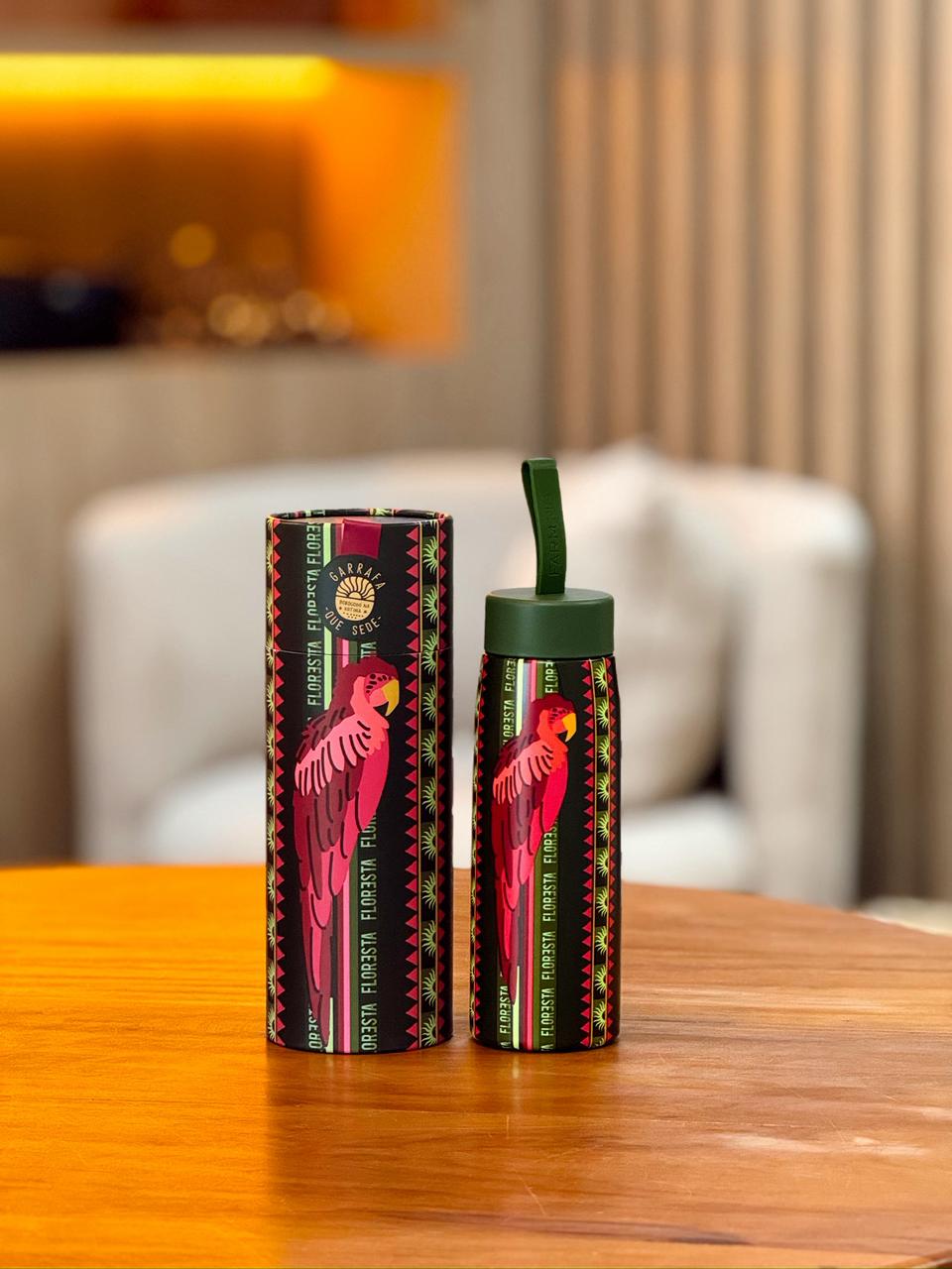 A garrafa da Farm Rio (ou “FARM RIO”) descrita na imagem é uma garrafa com capacidade de 500 ml. Ela possui um design com estampa vermelha de uma figura humana e detalhes em preto, além de uma tampa preta com um canudo. O nome do produto é “JANELA DA MATA”, sugerindo um estilo inspirado em elementos naturais ou tropicais.