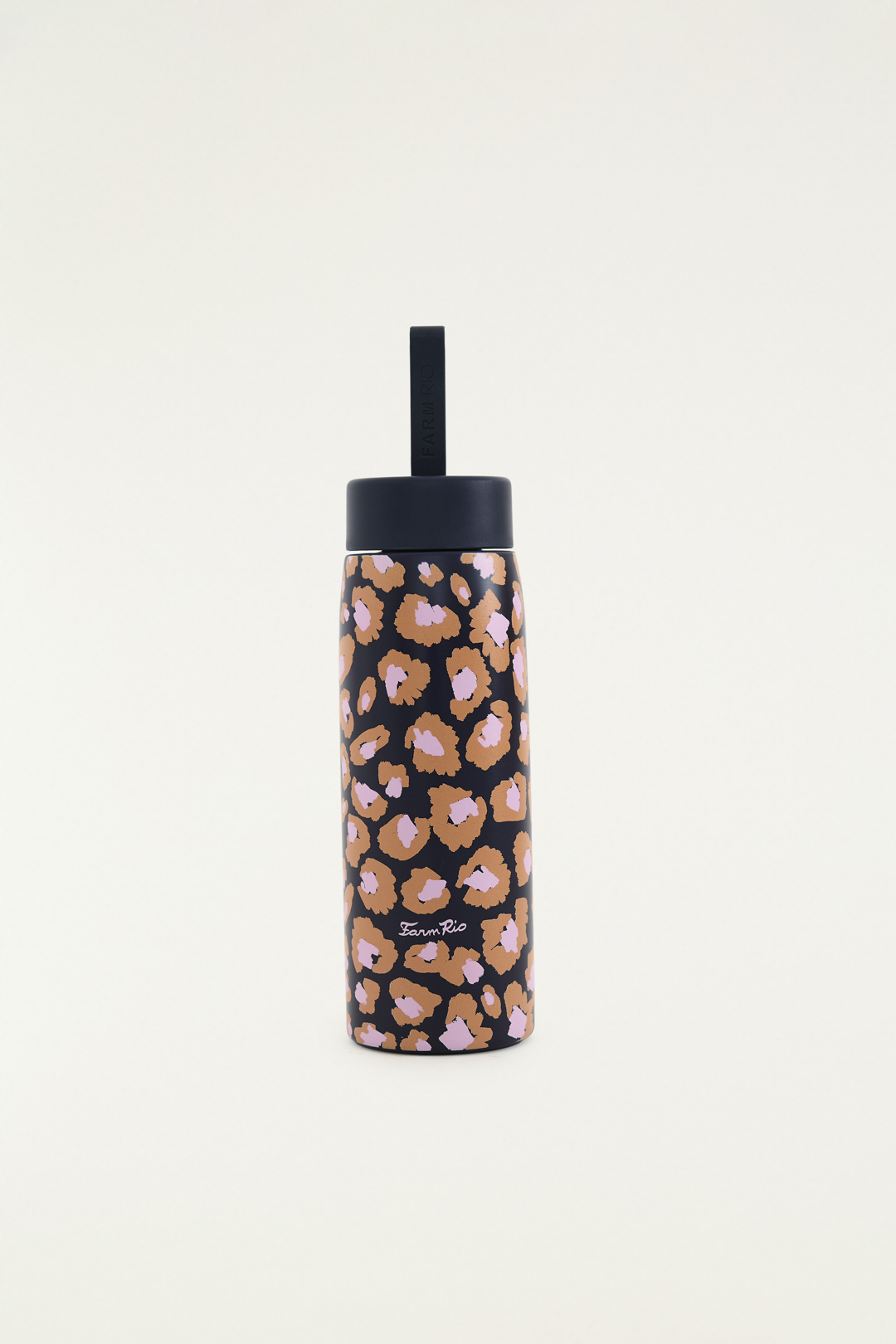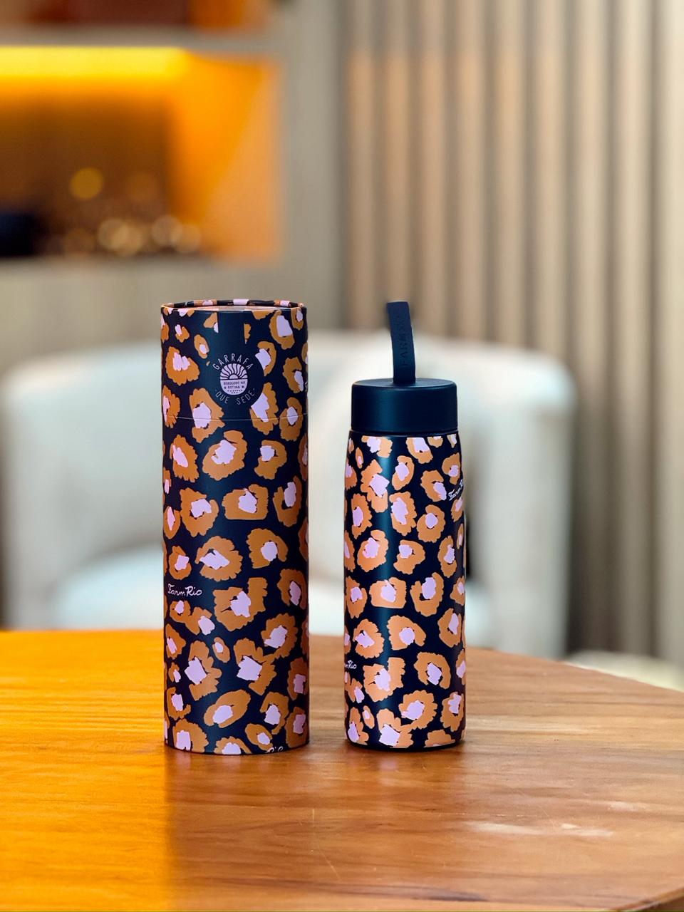A garrafa “Sede Leopard Pop” é um recipiente de 750ml com um design estilizado em estampa de onça (leopard), apresentando manchas marrons e bege sobre um fundo preto. Ela possui uma tampa preta e é promovida pela marca Farm, indicada para levar água ou bebidas, sendo um item fashion e funcional.