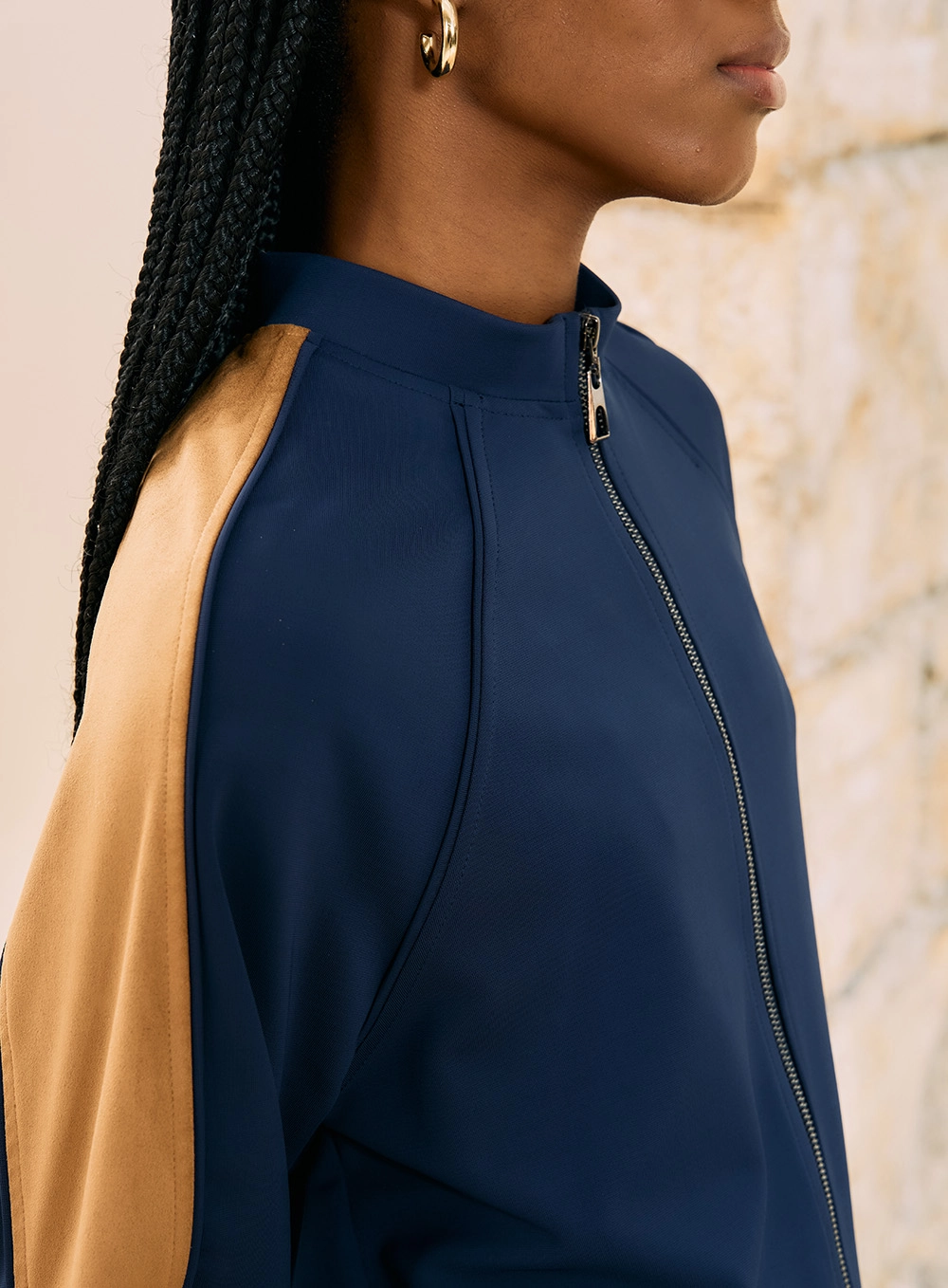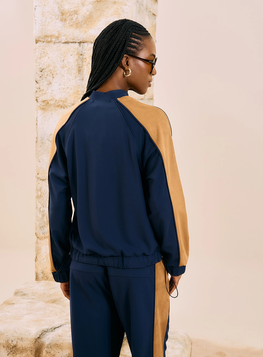 Detalhes: Recortes contrastantes nas mangas e laterais, barra e punhos com acabamento clean para um toque esportivo chic.