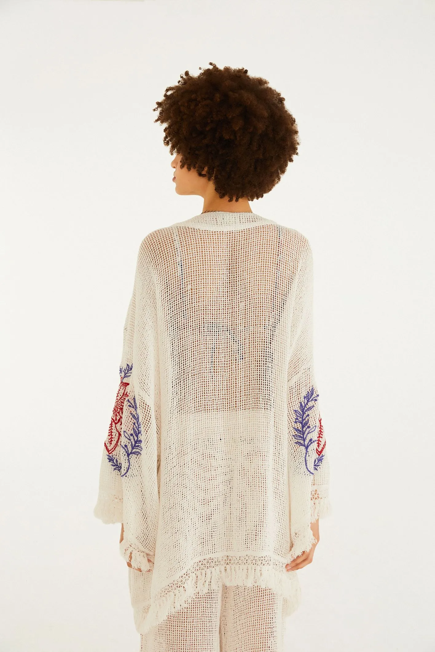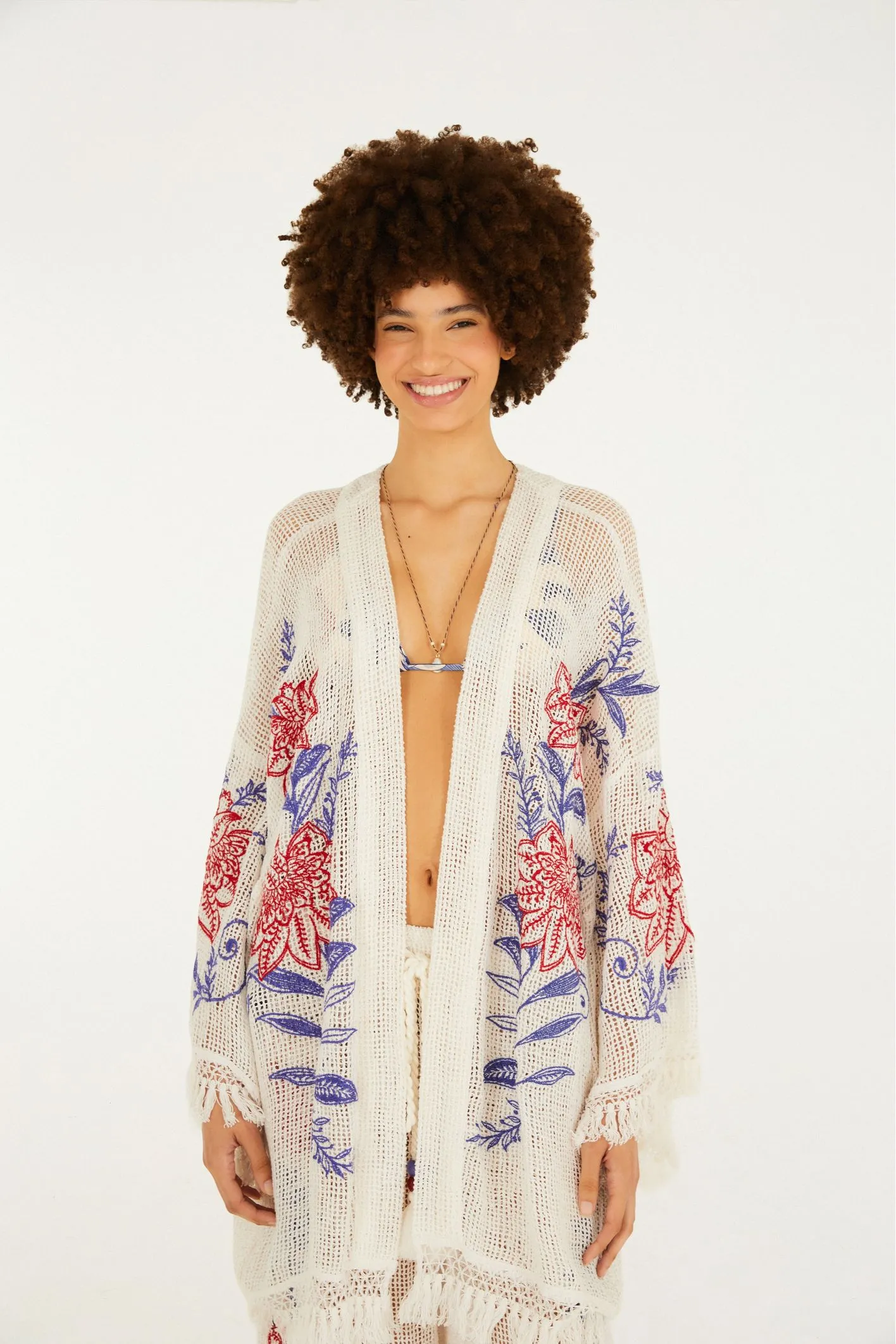 kimono bordado floral lina. traz a beleza dos bordados florais integrados no leve tecido de linho, transmitindo sensação de frescor. o corte solto, aliado às longas mangas, proporciona movimento único. um cinto delicado define o visual, perfeito para ocasiões informais ou sofisticadas, elevando qualquer look. FARM Rio, coleção Carioca – inverno 26.