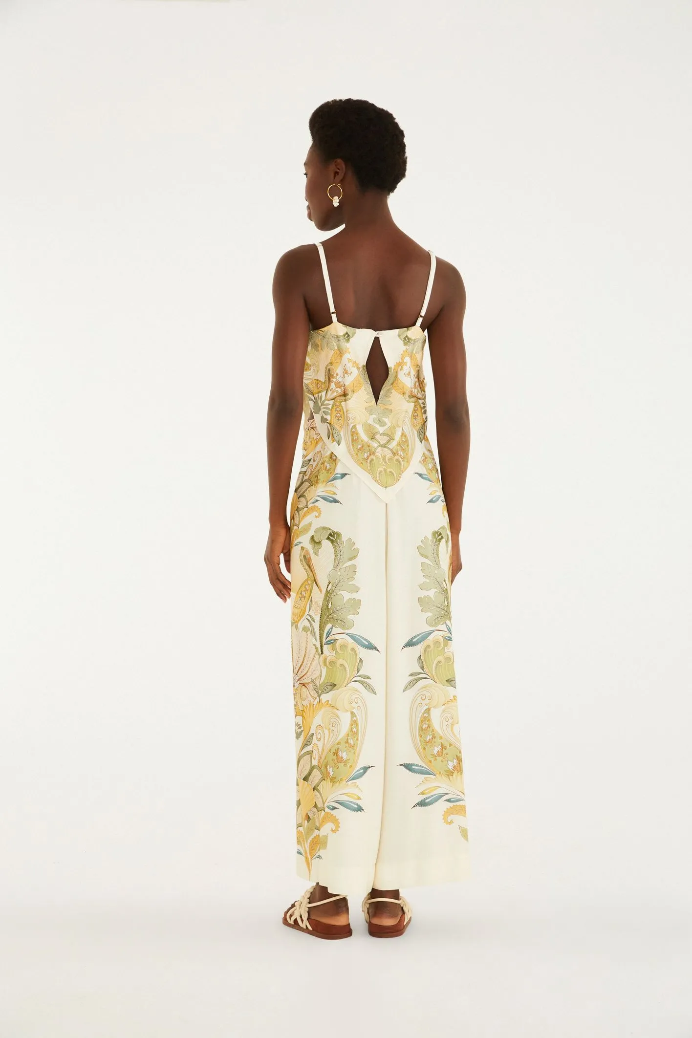 macacão jardim de mar. alças finas e ajustáveis sustentam o decote quadrado, enquanto um charme fluido se revela nas laterais estratégicas. o caimento solto proporciona leveza e liberdade para movimentos, ideal para dias casuais ou noites vibrantes. cada detalhe traz um toque de originalidade que só a FARM sabe oferecer. FARM Rio, coleção Carioca – inverno 26.