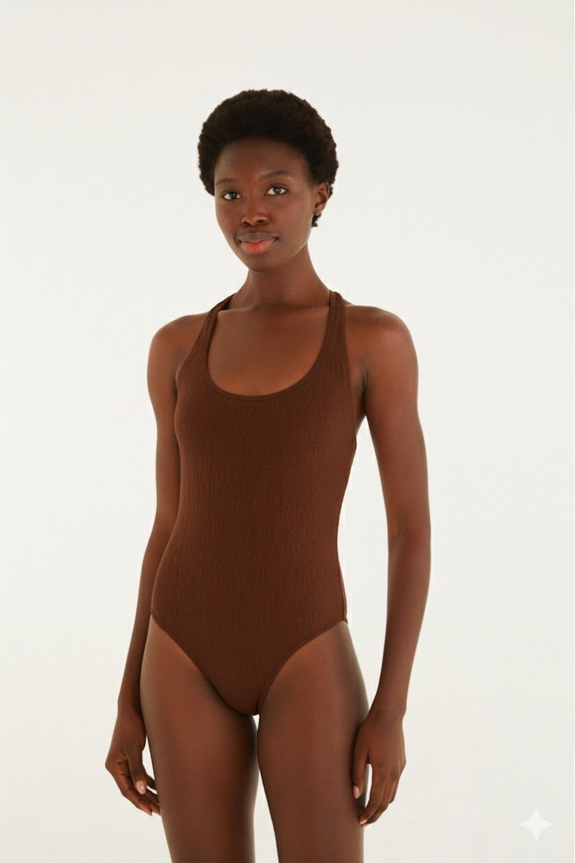 Este maiô da Farm apresenta um design minimalista e sofisticado, focando na textura e no corte clássico. Aqui estão os detalhes principais da peça: