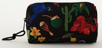 O necessaire da Farm é uma pequena bolsa retangular com estampa colorida de elementos tropicais, incluindo: