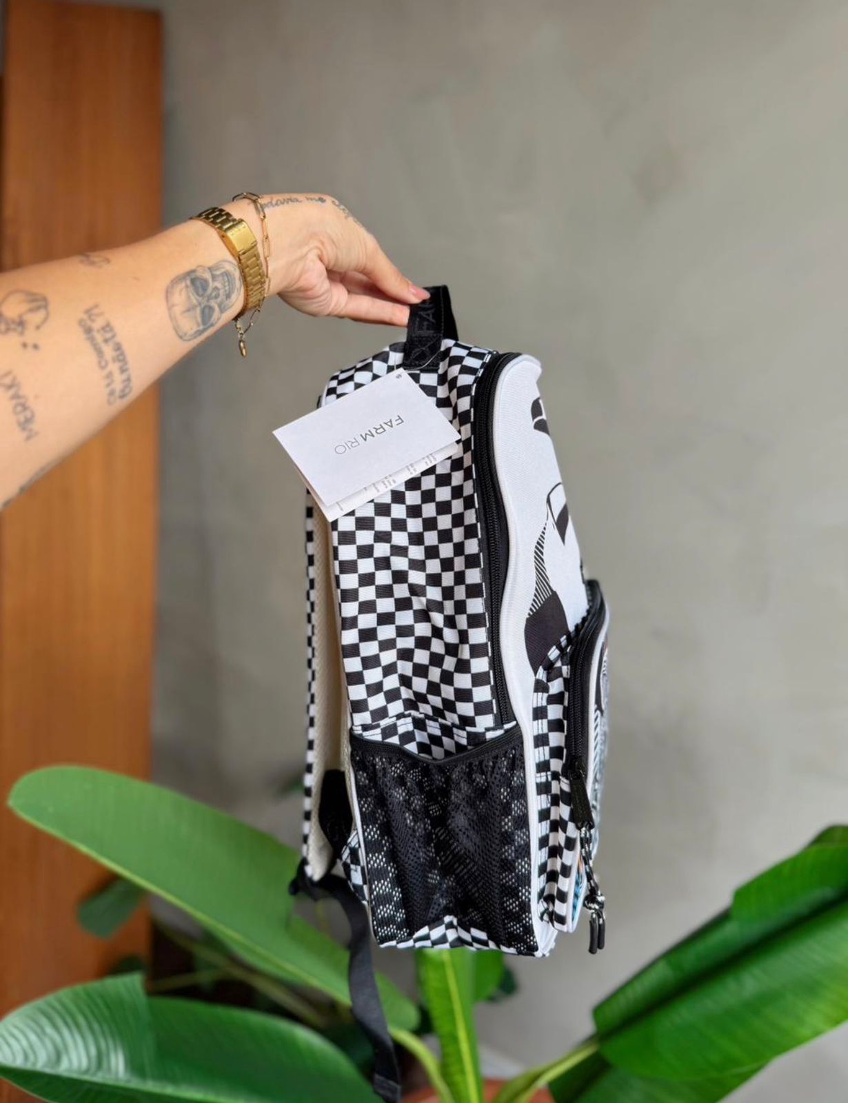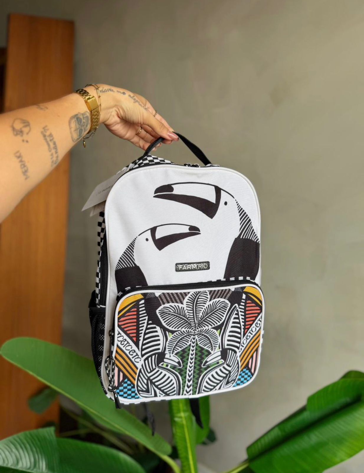 O texto na parte inferior da imagem descreve a mochila como “MOCHILA ME LEVA RICARDO FOLKEN LAP”, indicando que pode ser um modelo exclusivo ou colaborativo da marca Farm Rio.