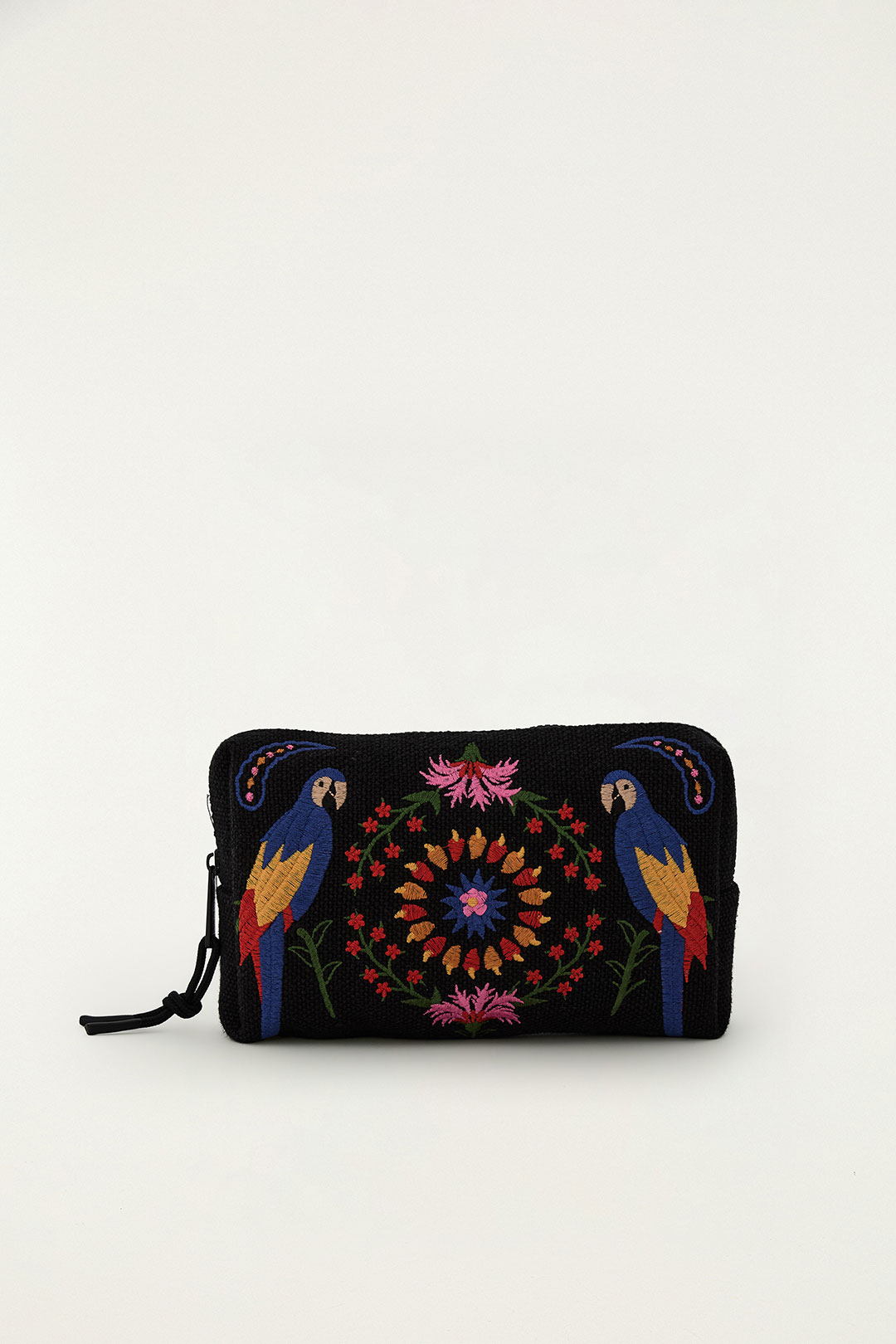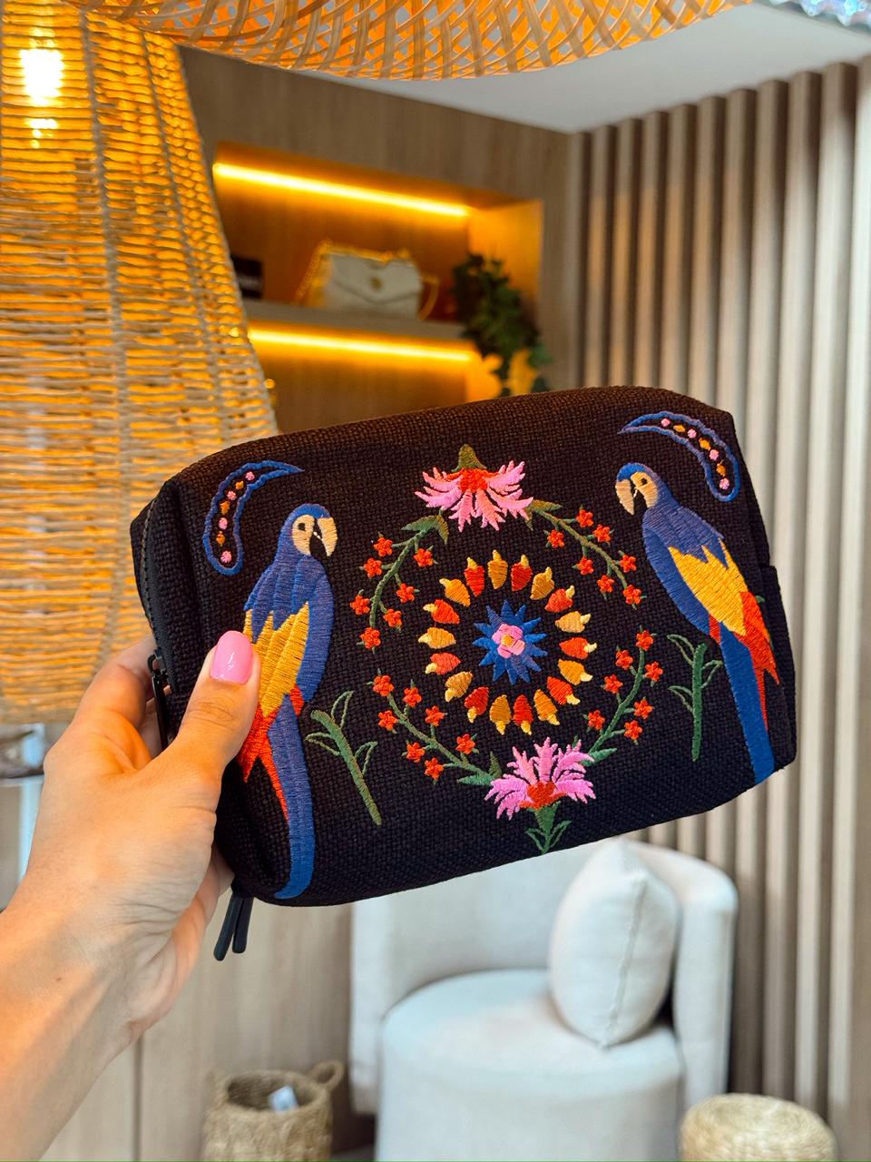 O desenho central é um mandala floral composto por uma flor grande amarelo-azulada rodeada de flores vermelhas e uma florzinha rosa no topo, ladeada por dois papagaios azul-amarelados simetricamente posicionados nas laterais. A bolsa possui um zíper preto e um cordão de pulso. Abaixo da imagem, o texto parcialmente visível indica “NECESSAIRE ORA BOLAS M TAPECARIA – FARM…”, sugerindo que é uma nécessaire de bolsas médias com estampa de tapeçaria