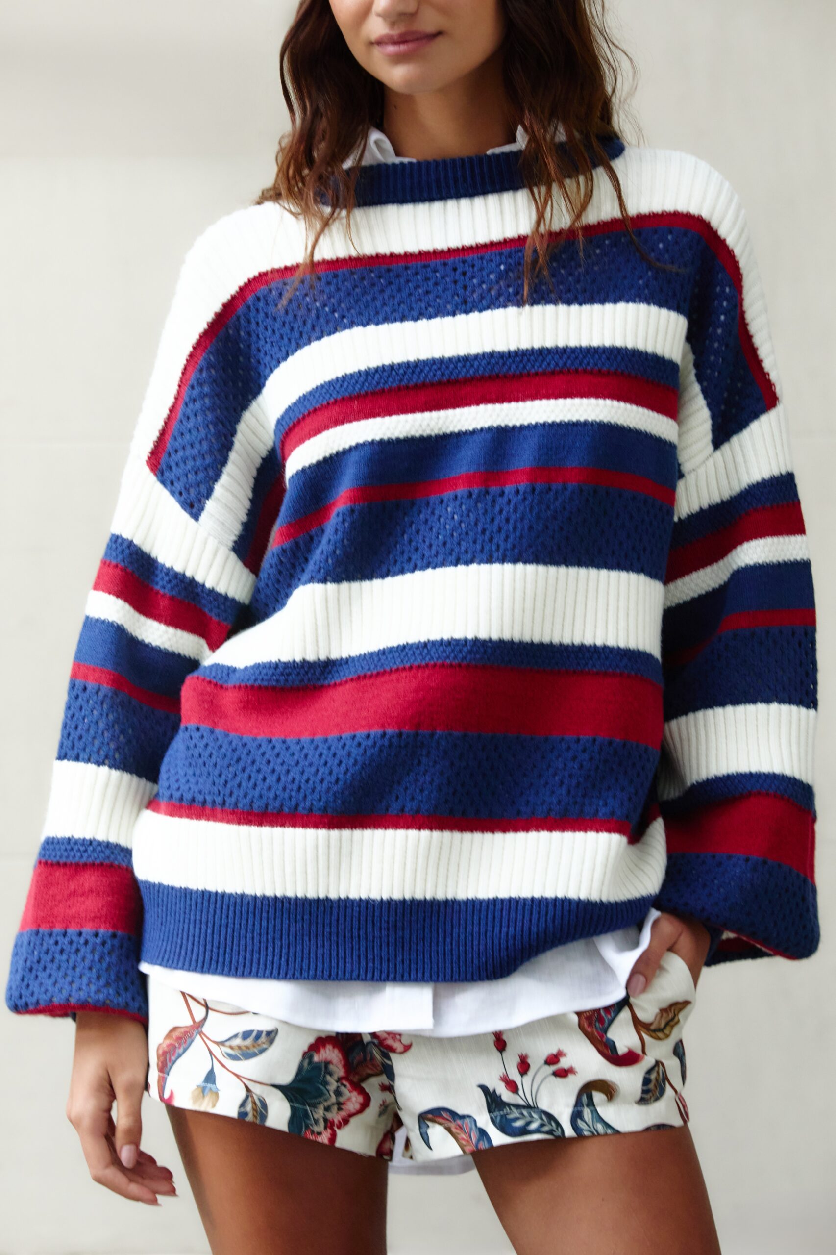 pull tricot textura listra magia é um convite à originalidade e ao conforto. com decote redondo e mangas longas, sua modelagem solta traz leveza e versatilidade. o trabalho delicado do tricot cria texturas que enriquecem a peça, perfeita para um look casual ou para eventos mais descontraídos. FARM Rio, coleção Carioca – inverno 26.
